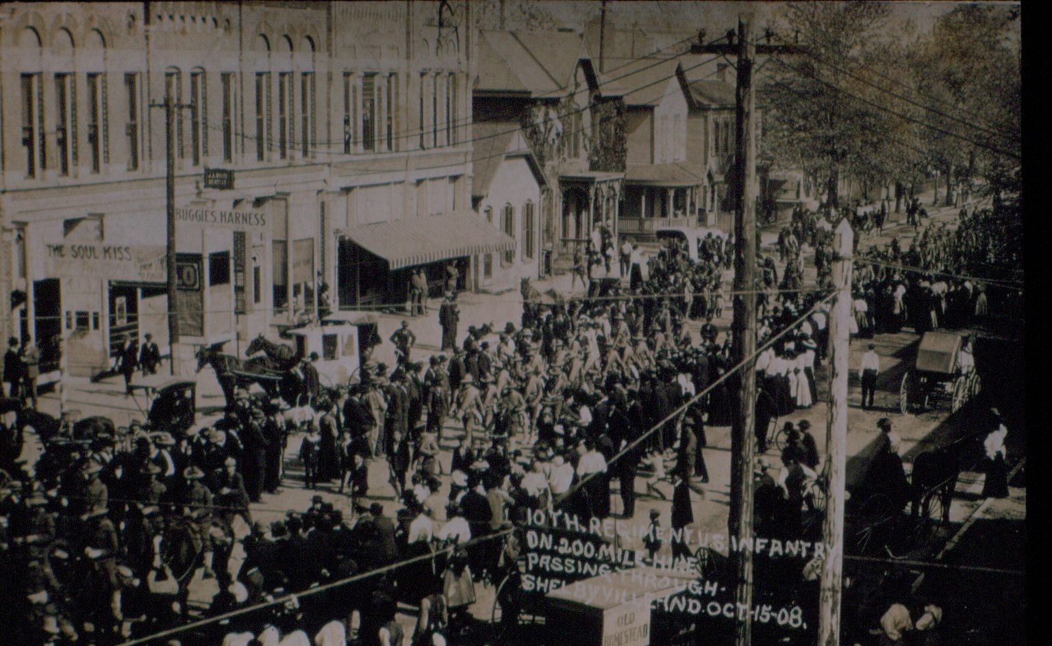 Black & white; crowded street scene; upper left portion shows brick commercial buildings, one has sign : The Soul Kiss" another legible sign reads "Buggies & harness" next to commercial buildings is row of frame houses; uniformed soldiers on horseback & foot passing between 2 lines civilians; horse drawn vehicles visible; utility poles & overhead lines visible; lower right corner of image has white lettering "10th Regiment U.S. Infantry/on 200 mile hike passing through Shelbyville Ind Oct. 15-08"