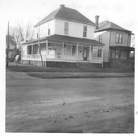 Black and white snapshot; image is 2 story frame house, clapboard siding;straight up and down box with a hip roof; does have a wraparound porch which is probaqbly not original; porch is roofed and supported by 10 posts, there is a railing around edge ofporch and similar railing except smaller under edge of roof lines; appears to be an extension on side of house at back that porch meets, corner where porch bends around house has a porch swing, but it is hung high for winter.