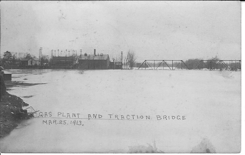 Donation, 07/26/2005. Black and white postcard in landscape format. On front: "Gas Plant and Traction Bridge/Mar. 25, 1913." Image of flood water over Traction Bridge.Collection