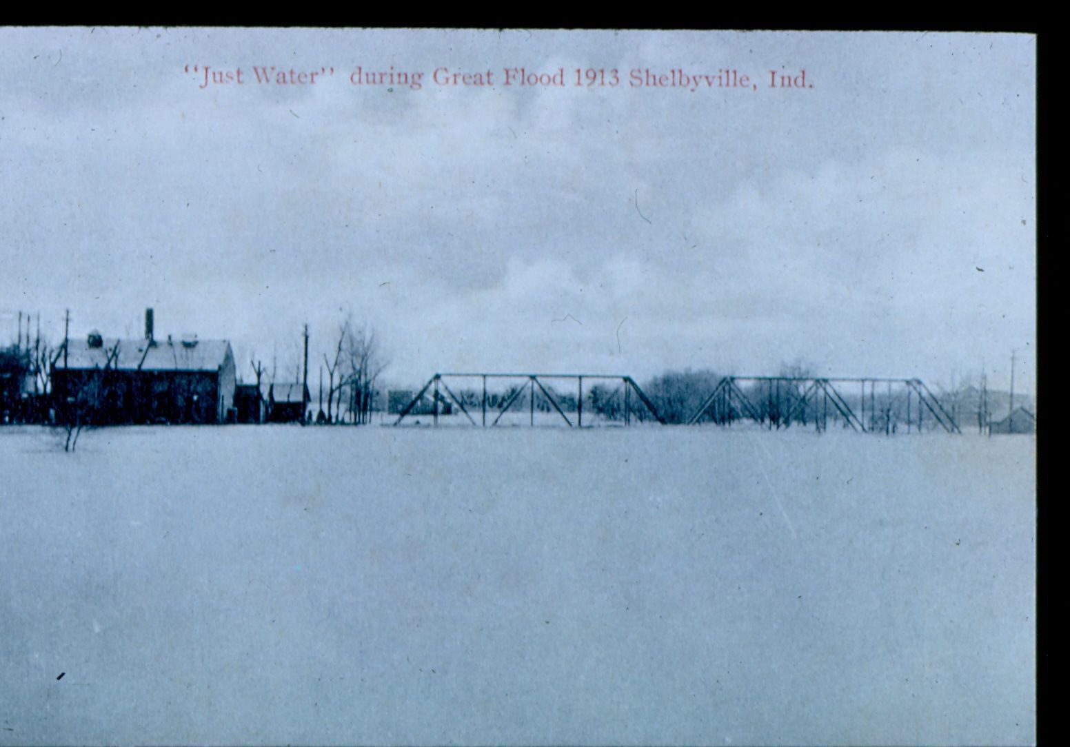Donation, 07/26/2005. Black and white photographic slide in landscape format. Slide frame marked: "1913 Flood/Gas House/Interurban Bridge."Collection