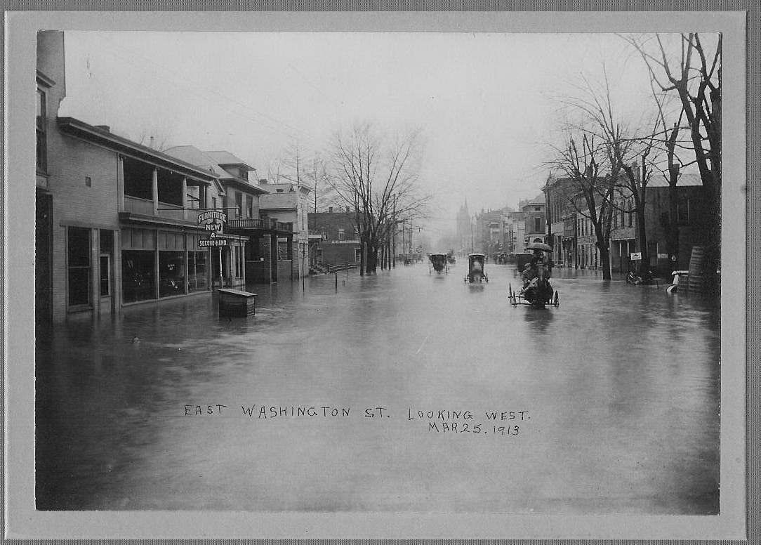 Donation, 07/26/2005. Sepia matte photographic print in landscape format of floodwaters on a city street. Several horse-drawn carriages can be seen with water up to wheel hubs and axles. In black on photo: "East Washington St. looking West/Mar.25.1913" In blue ink: "From Fred Cossairt".Collection