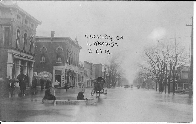 Donation, 07/26/2005. Black and white postcard in landscape format. On back in ink: "looking East/from Pike St." On front on image: "A boat ride on/E. Wash. St./3-25-13"Collection