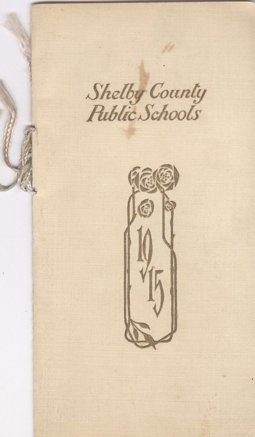 White booklet invitation to the Graduation Services of the Shelby County School Systems 1915 class. Golden stamped and embossed with the school system name and year on the cover, consists of 10 pages including covers. Bound with braided cord.Collection