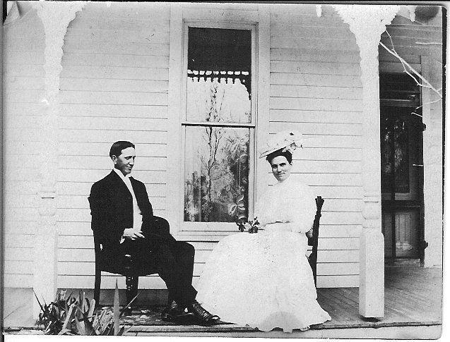 A b&w snapshot of 2 people sitting on a porch; man is to left and appears to be wearing a suit, shirt has high wing collar and is holding a derby hat; woman is to right wearing long light colored dress w/leg-o-mutton sleeves; hair is on top of her head and has on a flat hat w/plumes or something attached to it; she is holding stem of a plant; between them is a window and get a good view of lace curtains; appears as if chairs and strip of carpet were brought out of house for the photograph. Possibly a wedding pictureCollection