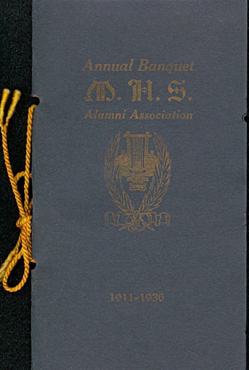 Title on front cover of program reads: Annual Banquet/M.H.S./ Alumni Association. Middle section shows the logo/seal of the organization. Below this are the years: 1911-1936.