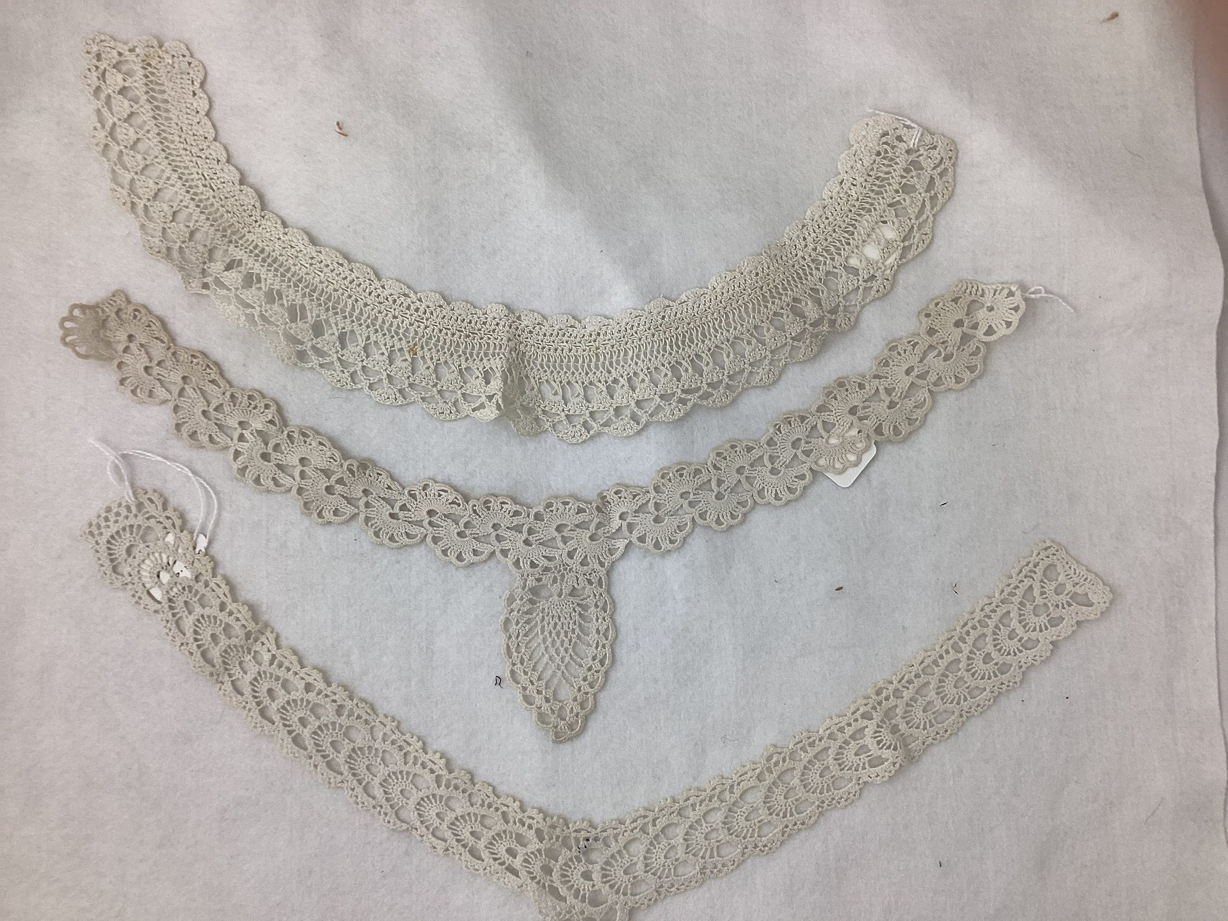 A: crocheted collar, one extra crochet in front (button loop?), 1.5 x 18.5"