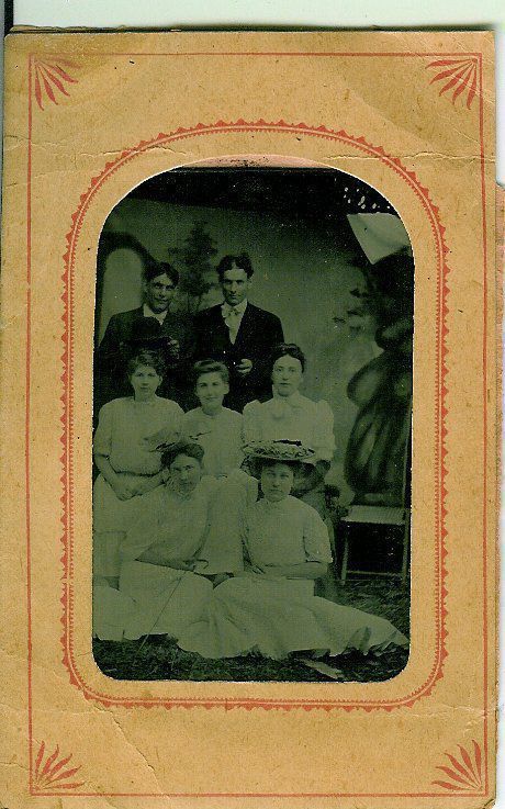 Tintype w/ b&w image of 7 people arranged in 3 rows; bottom row is 2 young women wearing long dresses with 3/4 sleeves and elaborate hats, girl on left is holding a thin cane; 2nd row is 3 young wormen seated, also wearing long dresses; 3rd row is 2 young men standing in coats and ties and holding derby hats over the heads of the two girls in front of them; false background also visible is a small stool. Stored is a salmon colored folder.Collection