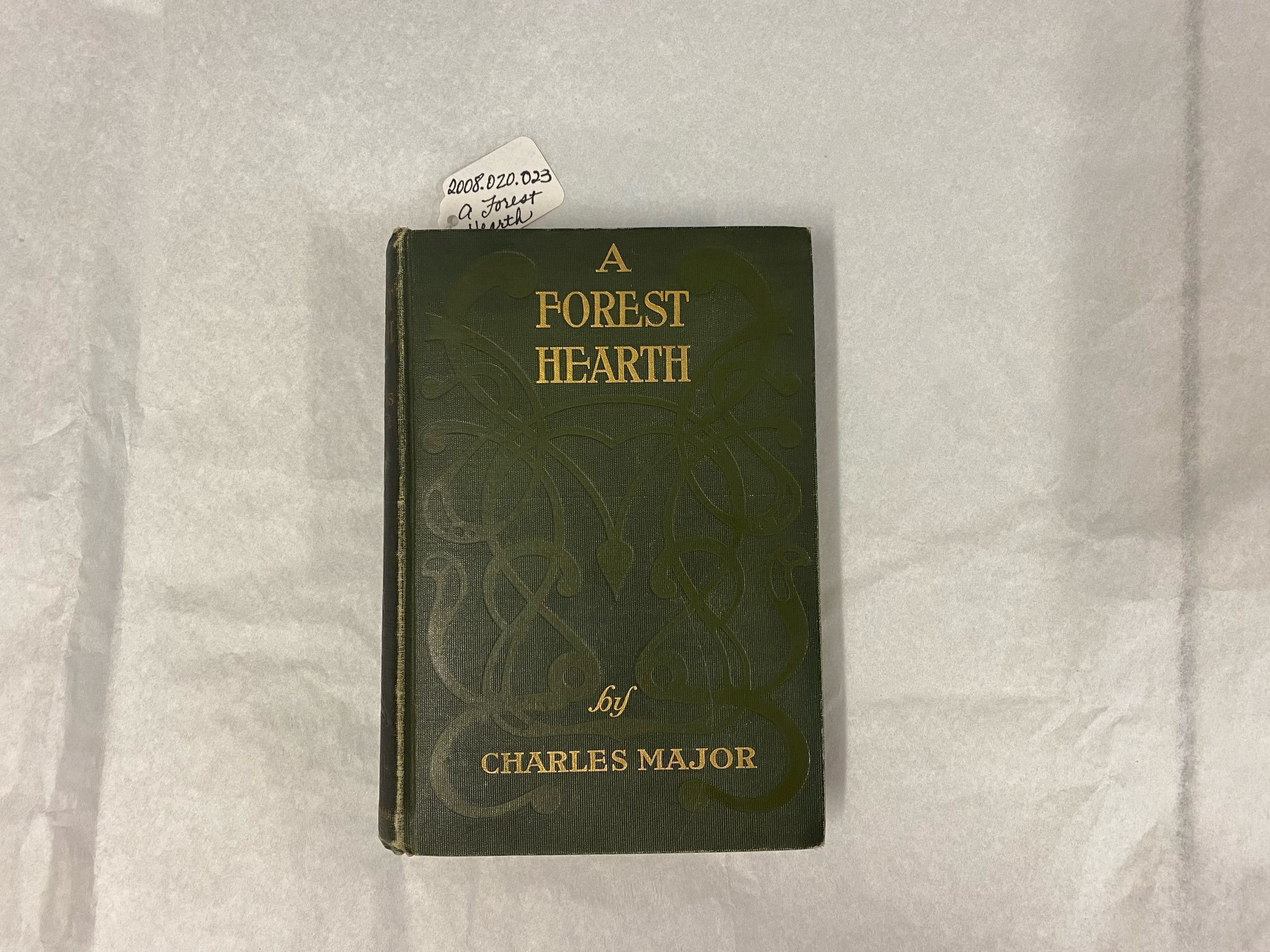 A forest green hardcover copy of "A Forest Hearth" by Charles Major. The book's title and author appear in large gold type at the center top and bottom of the front cover, respectively. A blind-stamped decorative design, in a slightly lighter shade of green from that of the hardcover, stretches across the front cover.Category