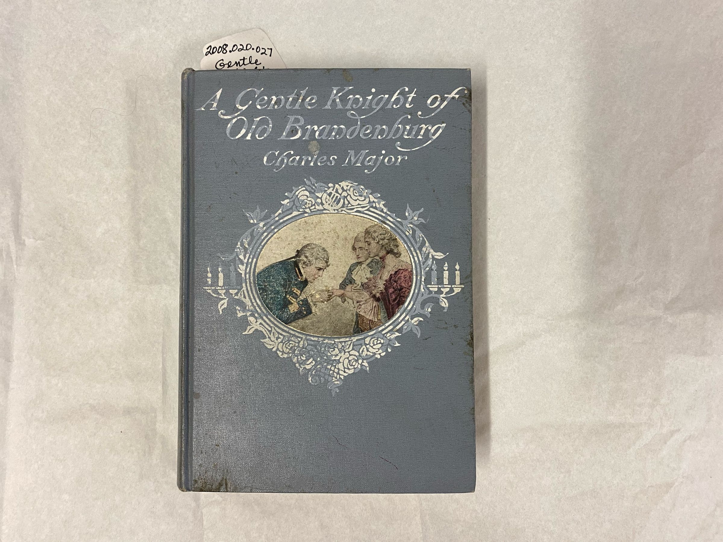 A light blue cloth hardcover copy of "A Gentle Knight of Old Brandenburg" by Charles Major. The book's title and author are stamped in white type at the top center of the front cover. Beneath the author's name is an oval illustration, outlined by a white decorative border with roses and vines, three candles each on the left and right, and a lyre at the top center. The illustration appears to have been adhered to the book by hand. It depicts two men and one woman, all dressed in late Baroque / Rococo garb and wearing white powdered wigs. The woman wears a red and pink ruffled bodice, with a red collar. The man standing to her right wears a blue petticoat, brown or gold vest, and white cravat. The third man, holding the woman's hand and bent over as if preparing to kiss it, is dressed in a military coat with ribbon in his hair.Category