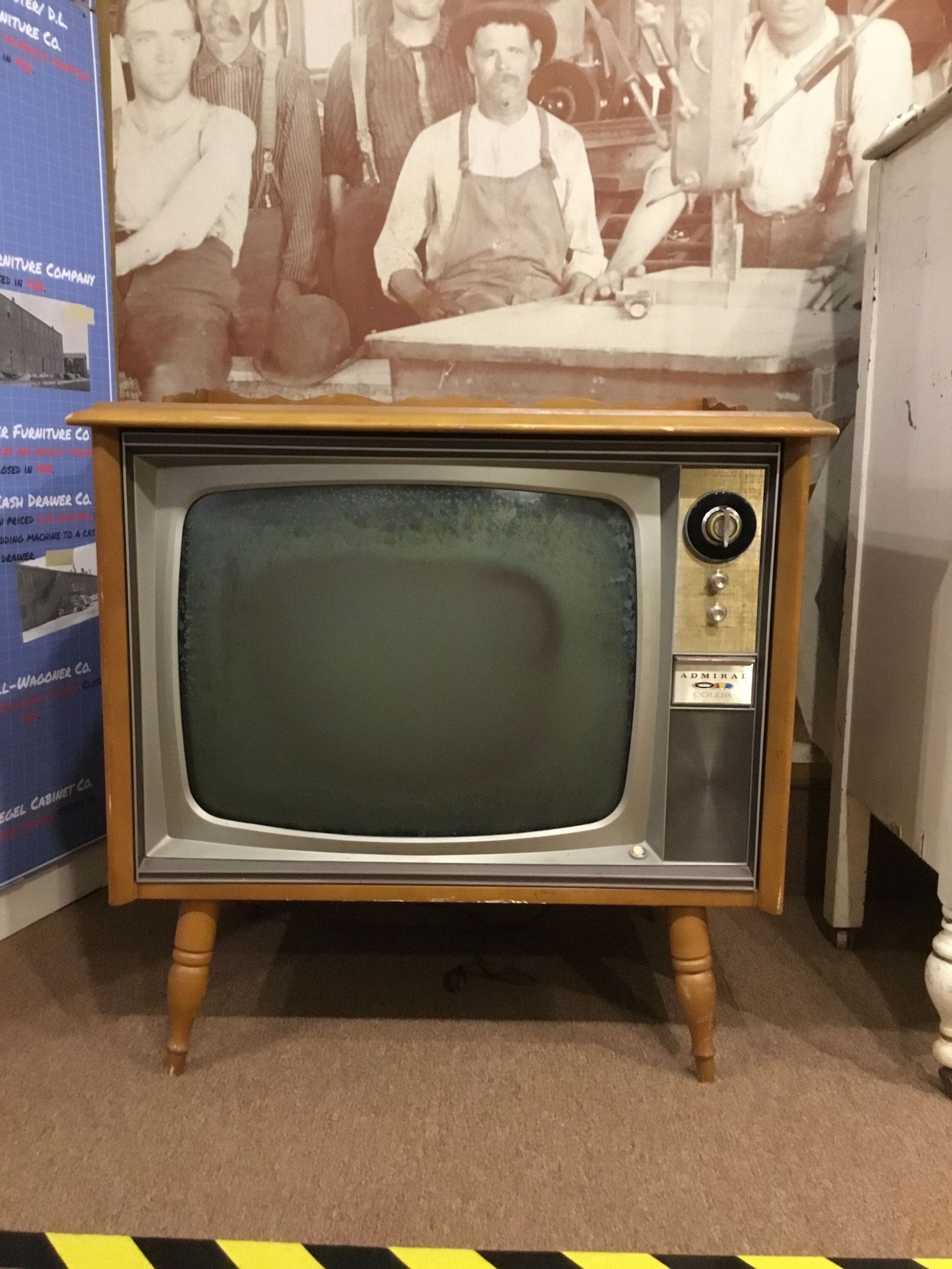 Wooden case housing an Admiral brand color television. TV was made in Chicago, case was made in Shelbyville.