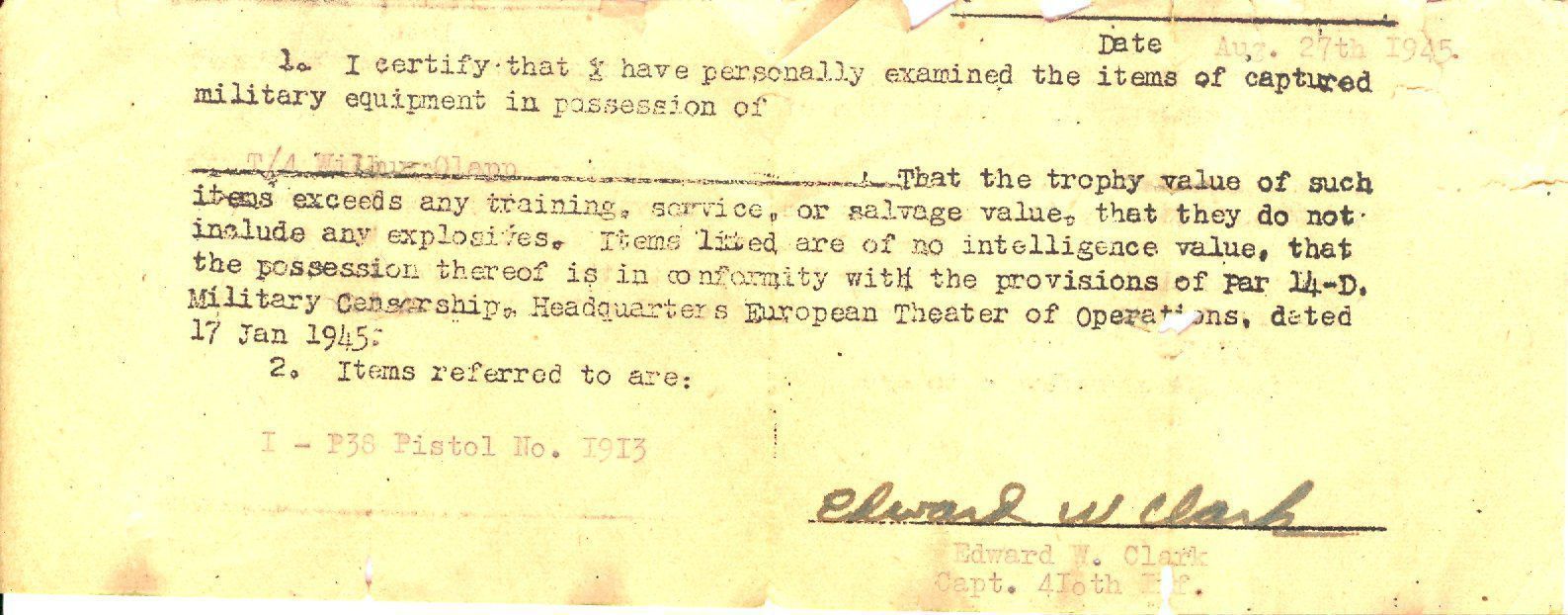 Enumeration Number one states: 1. CO Edward W. Clark has personally examined the items of captured military equipment in possession of T/A Wilbur Clapp.