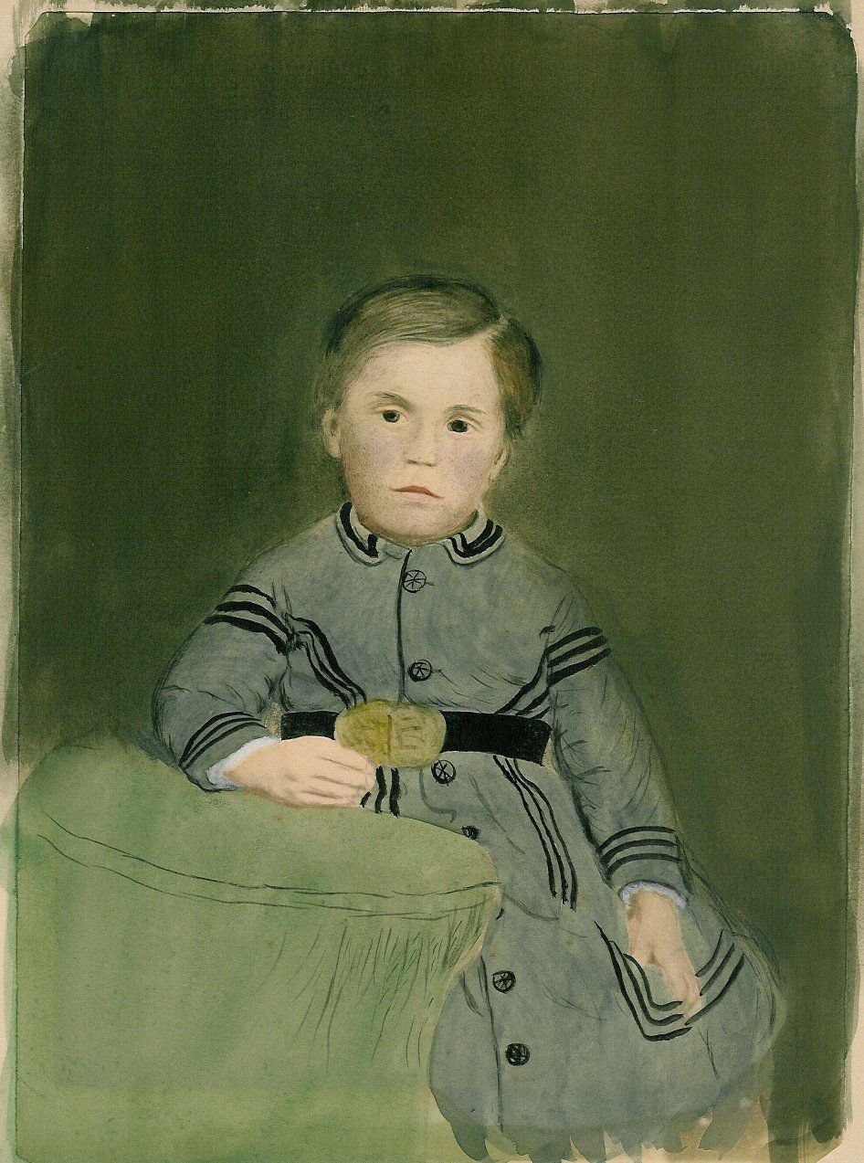 Watercolor and india ink painting of a brown-haired boy, sitting with right arm resting on green chair, gray dress with black trim, black belt with yellowish buckle, white cuffs showing, 7 buttons. Subject is: ALFRED MONROE, born in Shelby County on August 7, 1870, died July 14, 1931, buried in Winchester Cemetary, Shelby County, Indiana. Anonymous donation, 08/11/83.Collection