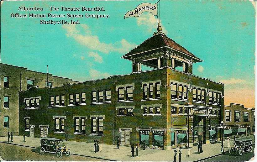 color picture postcard of the Alhambra Theatre building in Shvl. located corner of Harrison and Broadway; appears to be a drawing and not a photo; automobiles are visible on the street; Upper left of card is printed: "Alhambra. The Theatre Beautiful. Offices Motion Picture Screen Company, Shelbyville, Ind."