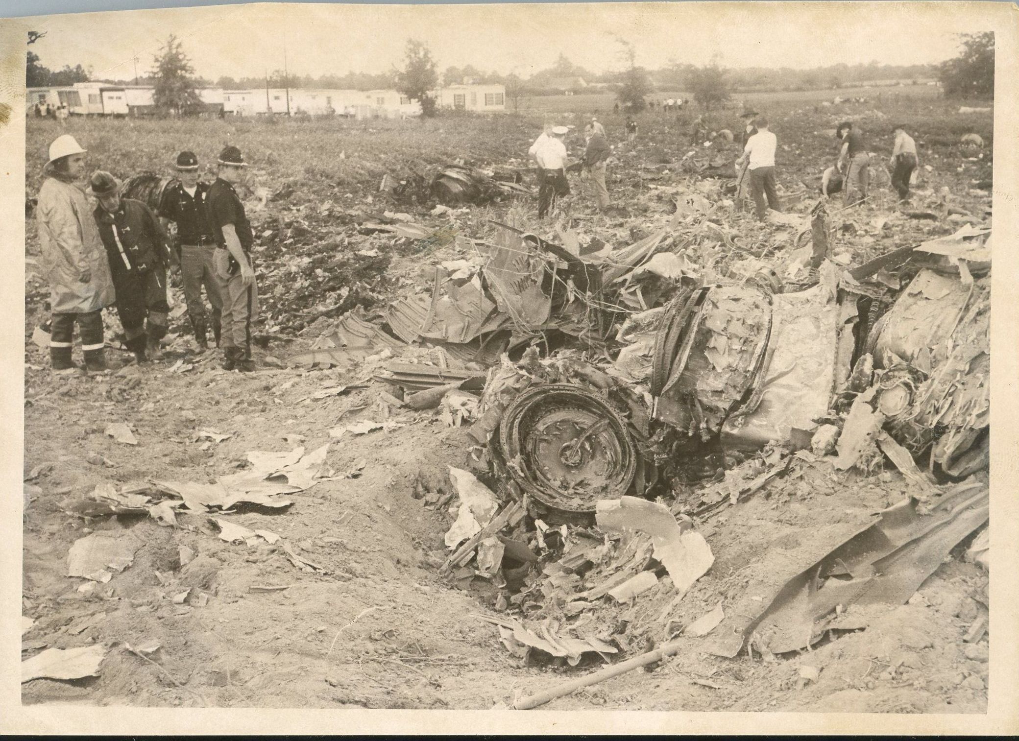 Black and white glossy photographic print in landscape format. View is of the site of the Alleghany plane crash in London, Indiana, Shelby County on 09/09/1969. View is of policemen, firemen and others looking through debris at the crash site. Mobile home park is in the background on the left. Donation 11/11/2004 from Tina Justice, daughter of Richard Sebastian.Collection