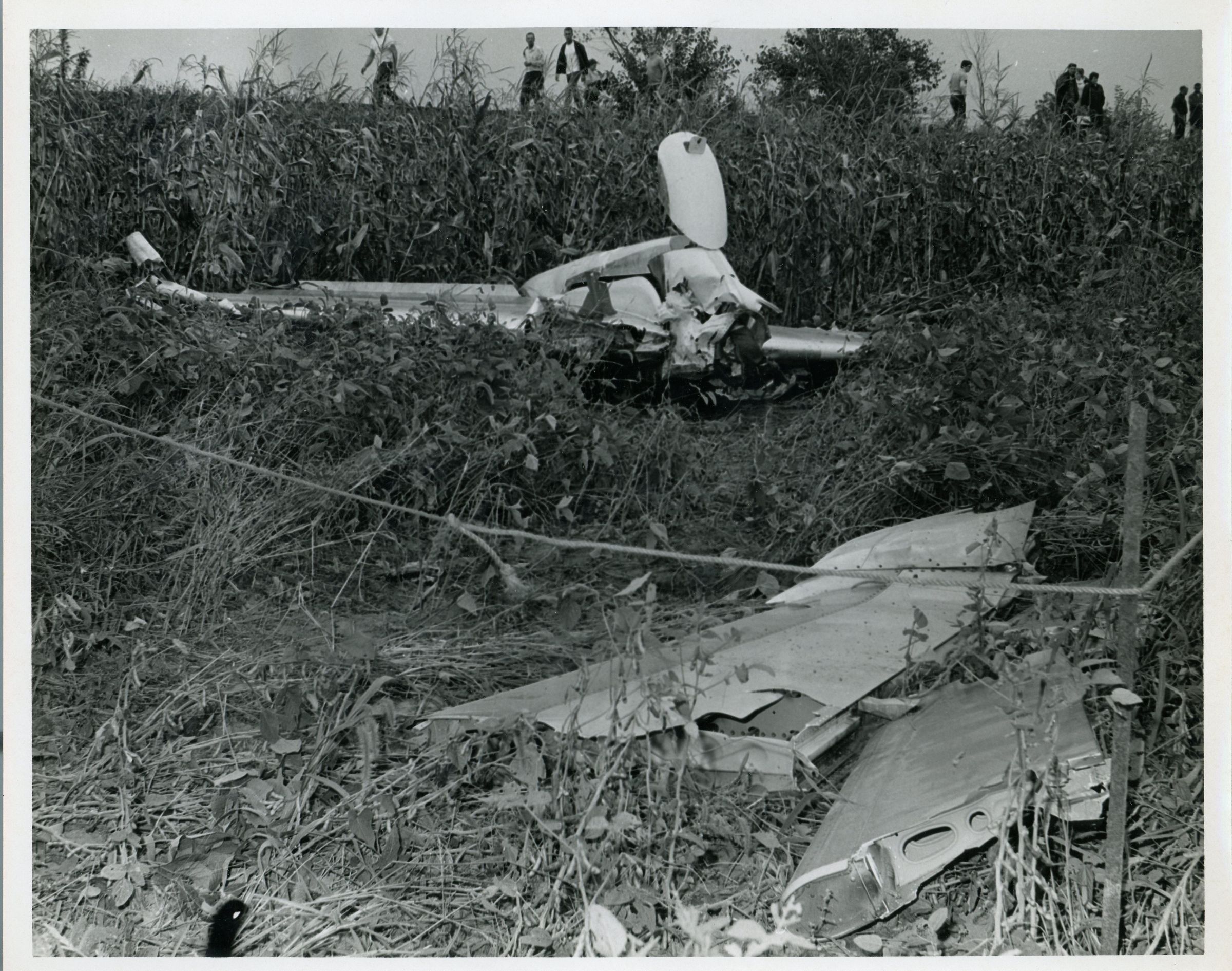Black and white glossy photographic print in landscape format of one part of the site of the Alleghany plane crash in London, Indiana in Shelby County on 09/09/1969. View is of parts of the plane in a corn field. Area has been roped off. Donation 11/11/2004 from Tina Justice, daughter of Richard Sebastian.Collection