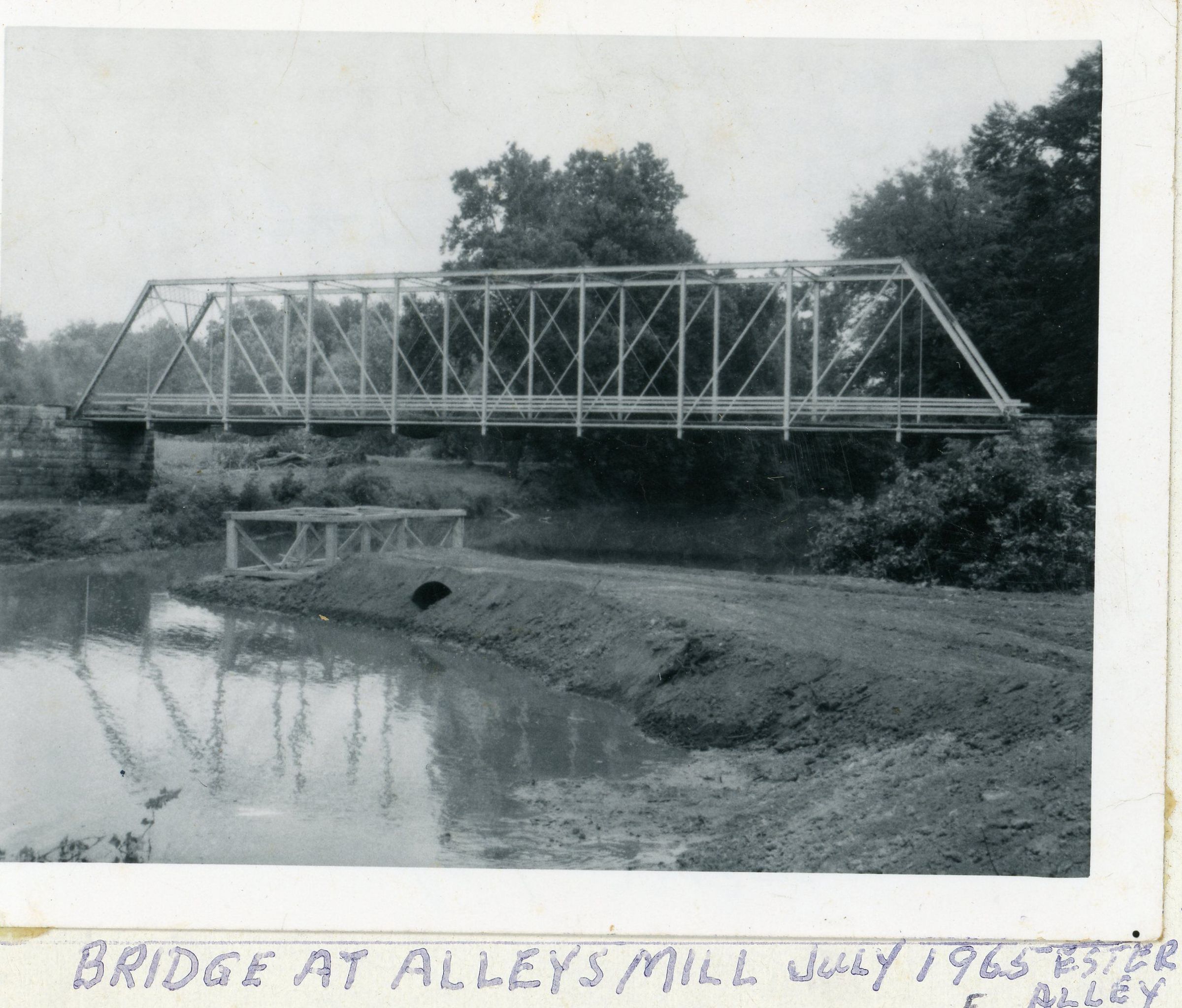 Black and white photograph of bridge at Alley's Mill, July 1965.Photograph Details