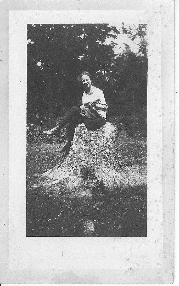 Black and white glossy photo in portrait format. Image shows Alma at YMCA Camp near St. Paul, IN. Sitting on a stump with her ukelele.Photograph Details