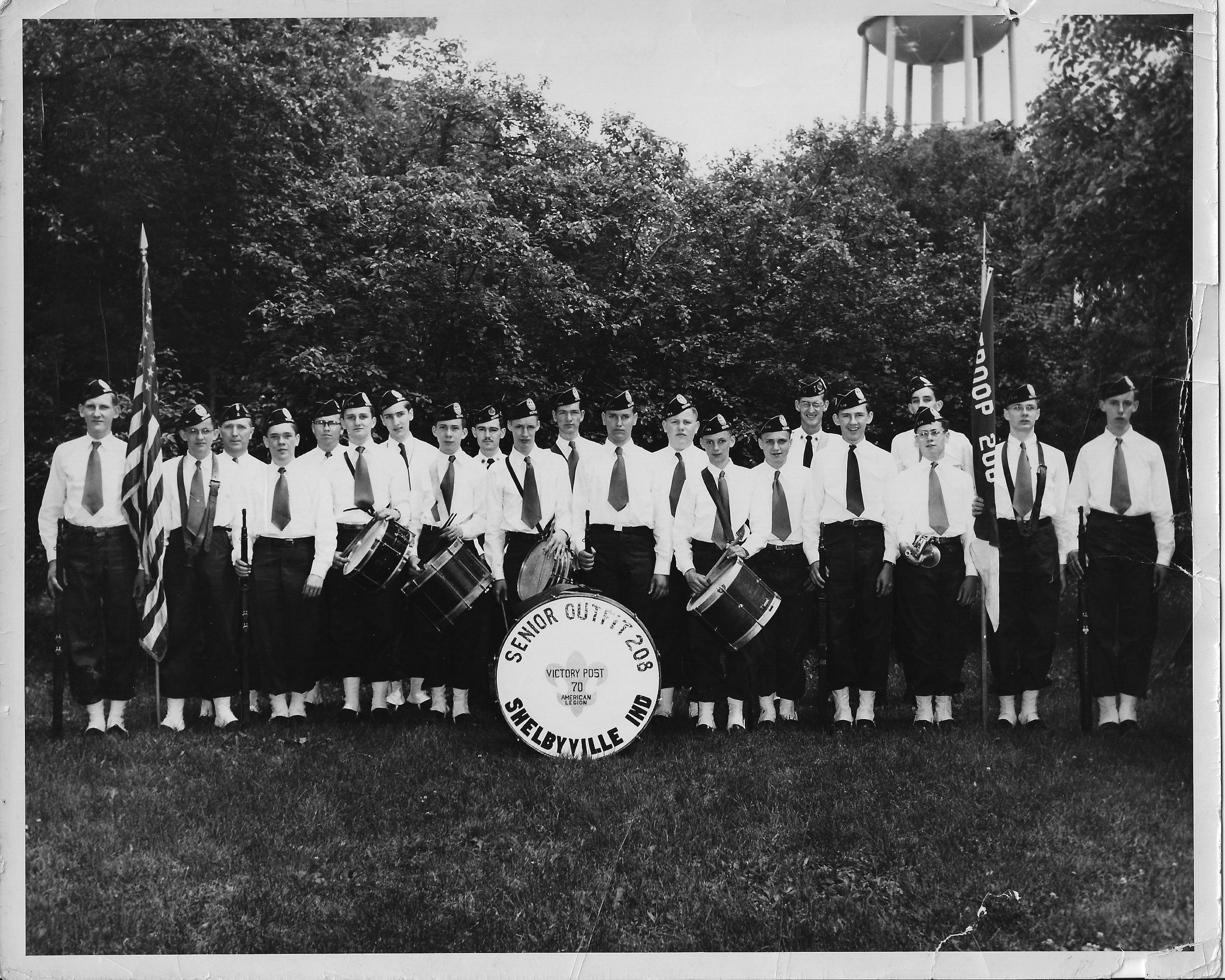 American Legion, Victory Post 70, Senior Outfit 203, of Shelbyville, Indiana. Group of twenty-one men posing for group photograph, dressed in full-parade dress. Trees in the background, with a hint of the Shelbyville water tower showing. Location, date, and persons present at the gathering is unspecified. Large drum in the foreground identifies the Shelbyville, Indiana chapter of the American Legion.Collection