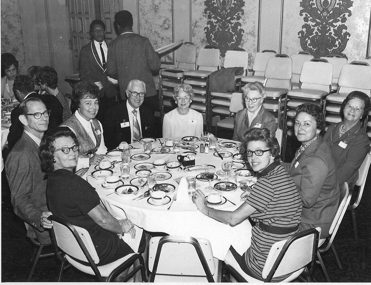 Black and white 6.5" x 8.5" glossy photo in landscape format. Image shows a group of Shelby County Red Cross members at a banquet. Members are seated around a round table.Collection