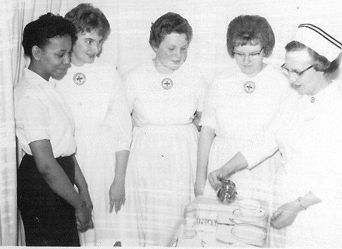 Black and white 3.5" x 4.5" glossy photo in landscape format. Image shows candy strippers at Major Hospital. One is pouring tea while others look on.Collection