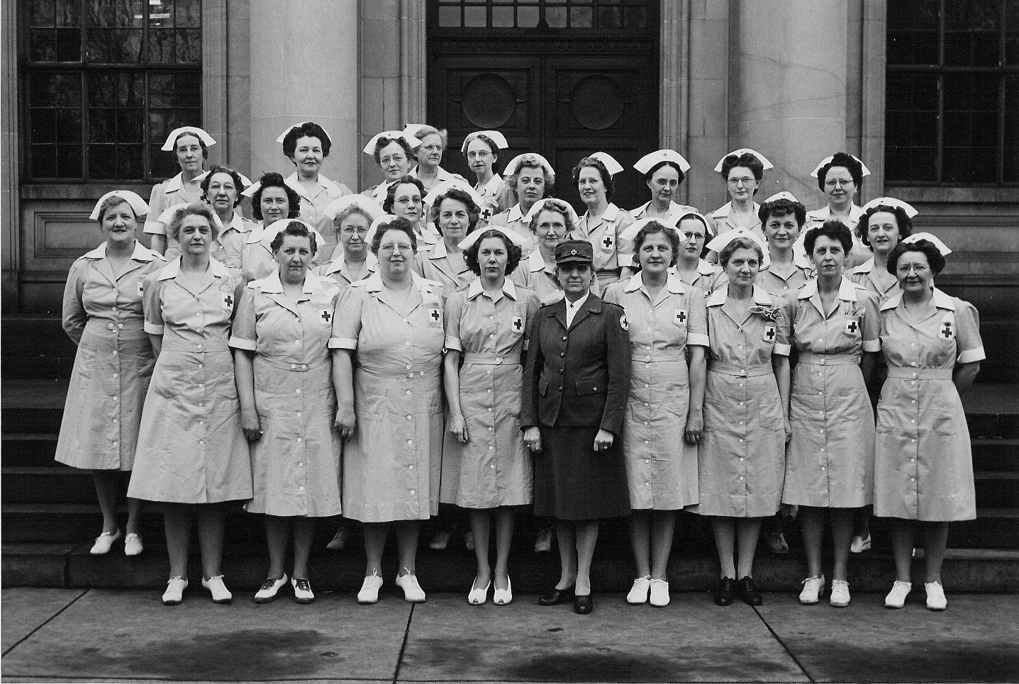 Black and white glossy photo in landscape format. Image shows a group of Red Cross volunteers, in uniform, in front of Shelbyville City Hall.Collection