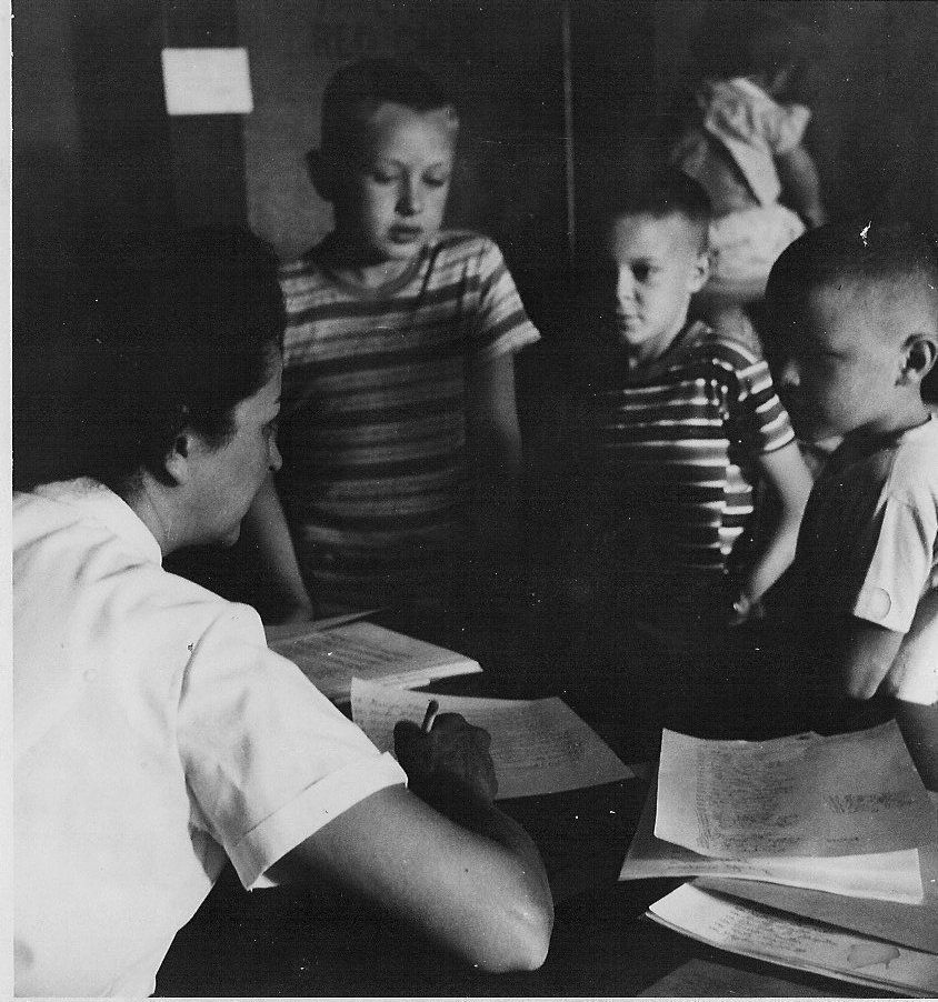 Black and white 6" x 6" glossy photo in landscape format. Image shows a Red Cross volunteer (Mabel Van Cleve) registering three boys for free Red Cross swimming lessons.Collection