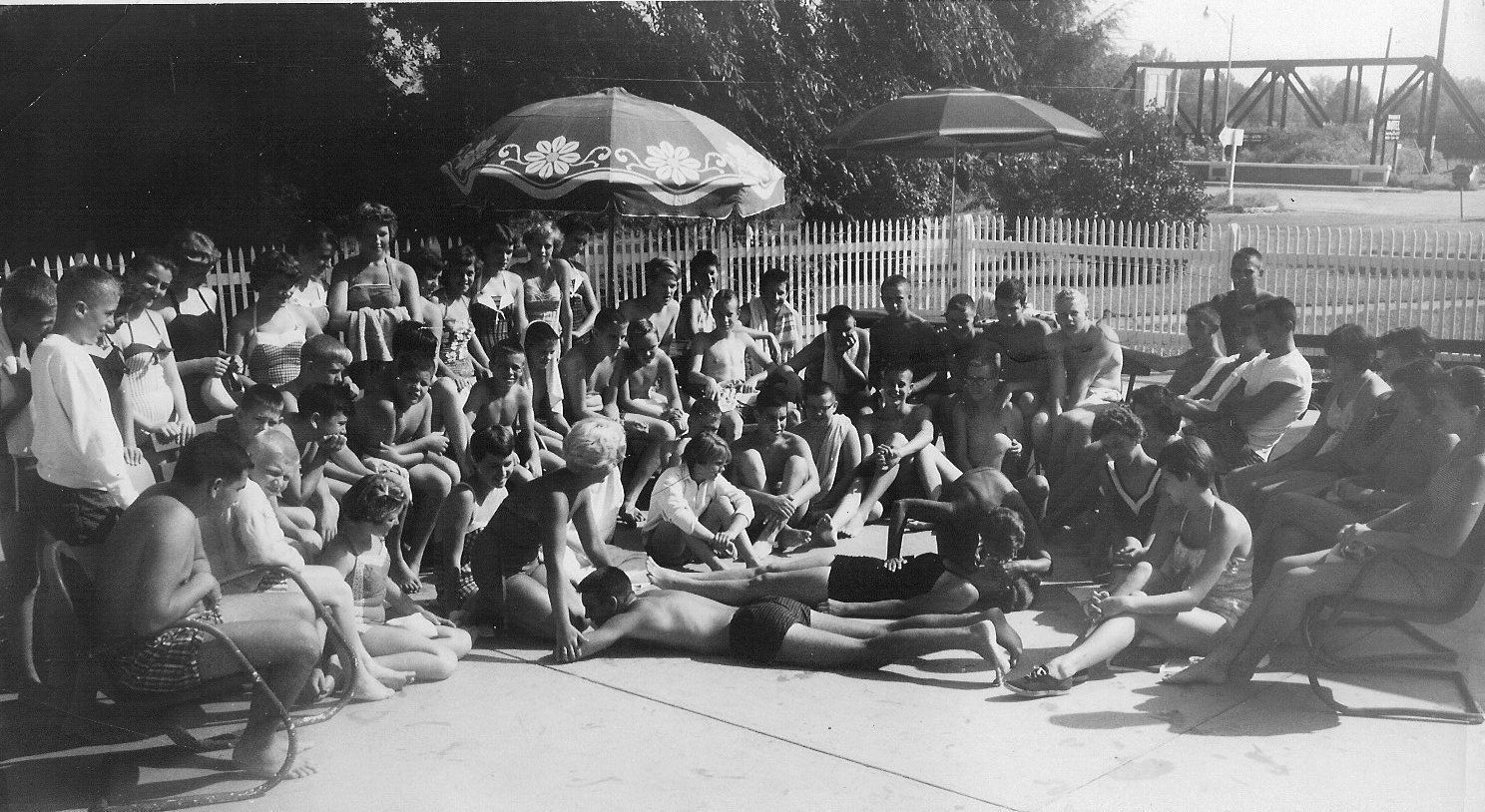 Black and white 6" x 10" glossy photo in landscape format. Image shows Red Cross volunteers with a group of children at Porter Pool conducting swimming lessons. Instructors are giving CPR lessons.Collection