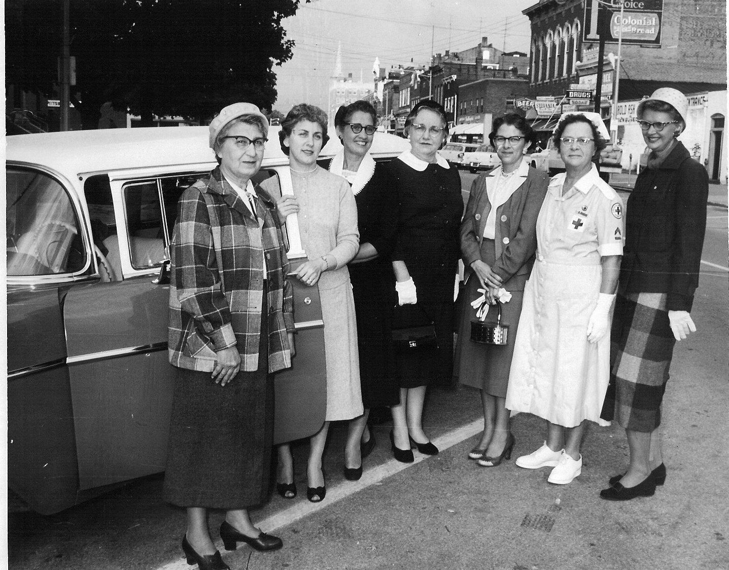Black and white 8" x 10" glossy photo in landscape format. Image shows a group of Red Cross ladies (one in uniform) standing in front of a car on E. Washington St.Collection