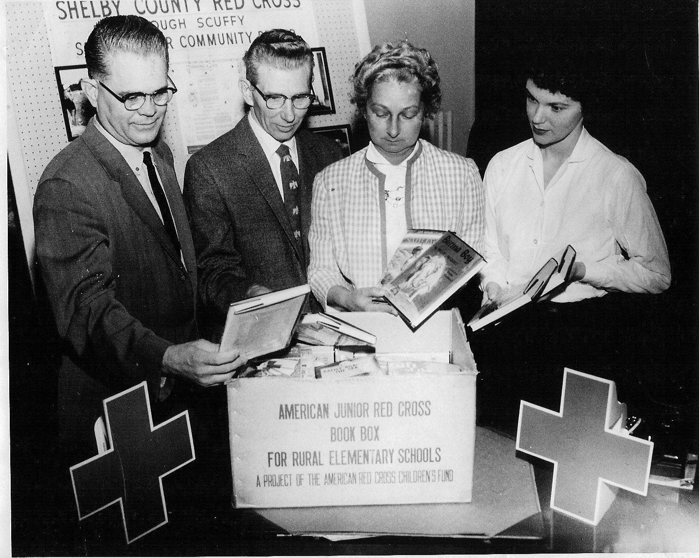 Black and white 8" x 10" glossy photo in landscape format. Image shows two men and two women standing around a box of books labeled, "American Junior Red Cross Book Box For Rural Elementary Schools A Project of the American Red Cross Children's Fund."Collection