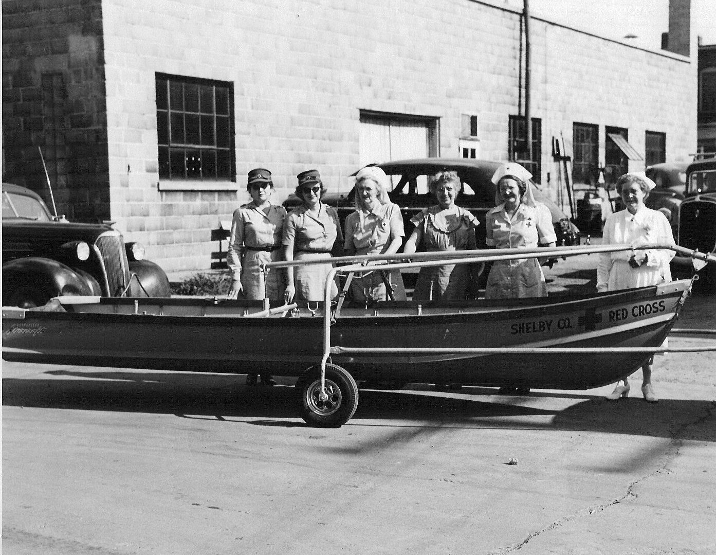 Black and white matt photo in landscape format. Image shows a group of ladies with a Red Cross boat.Collection