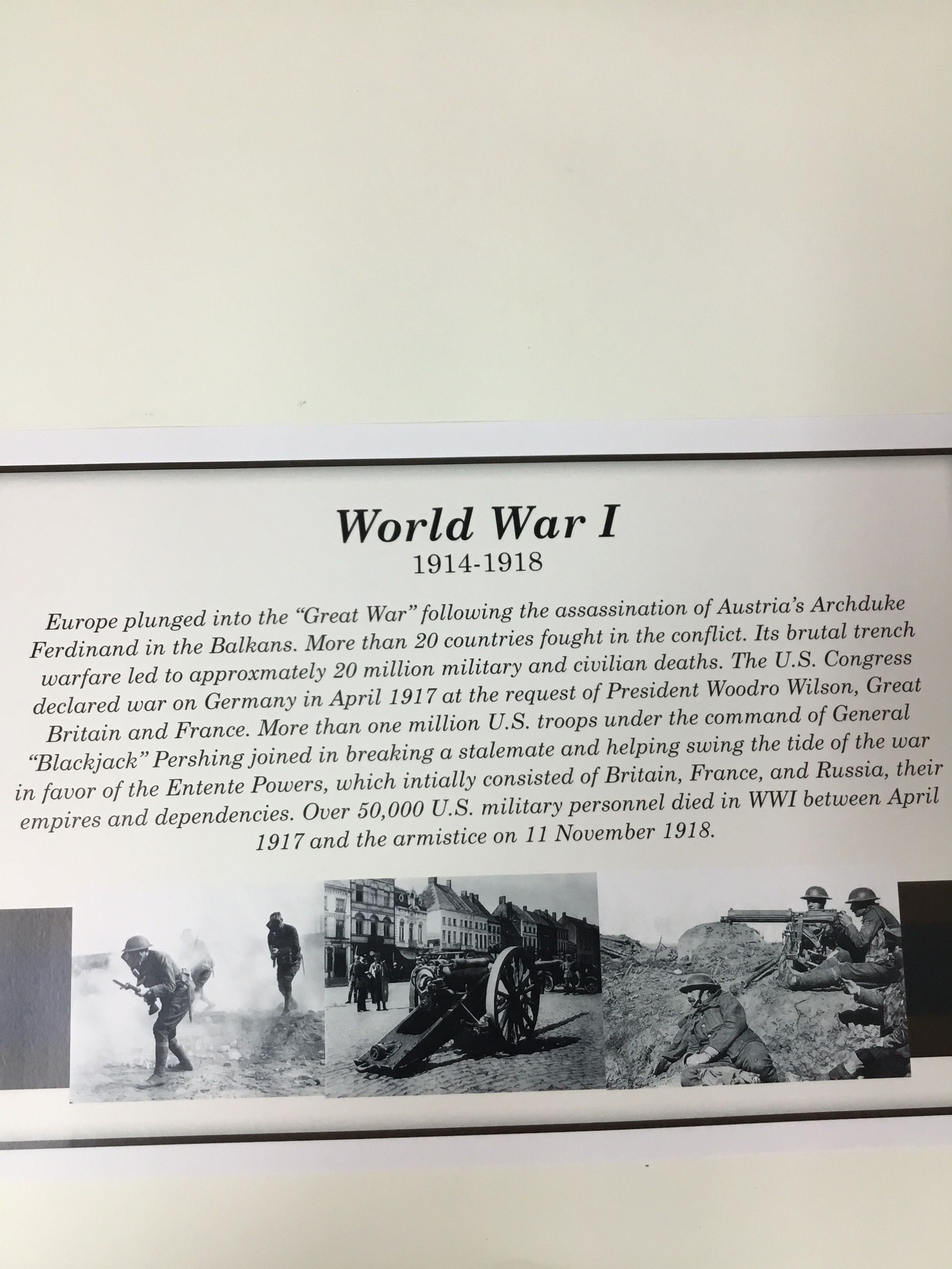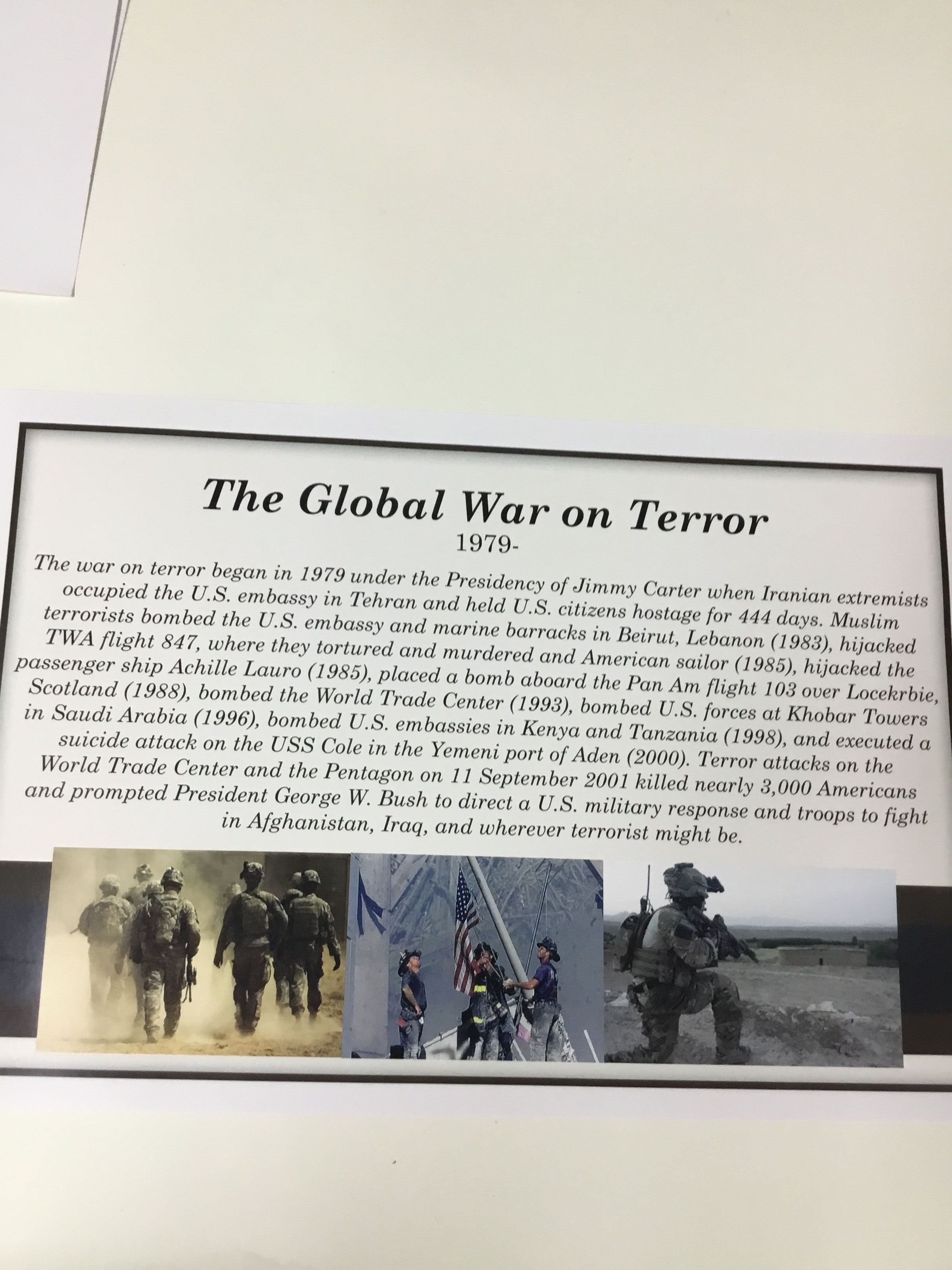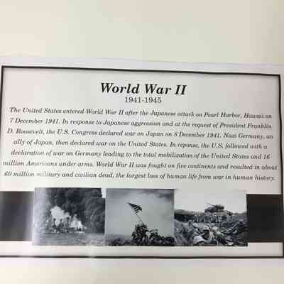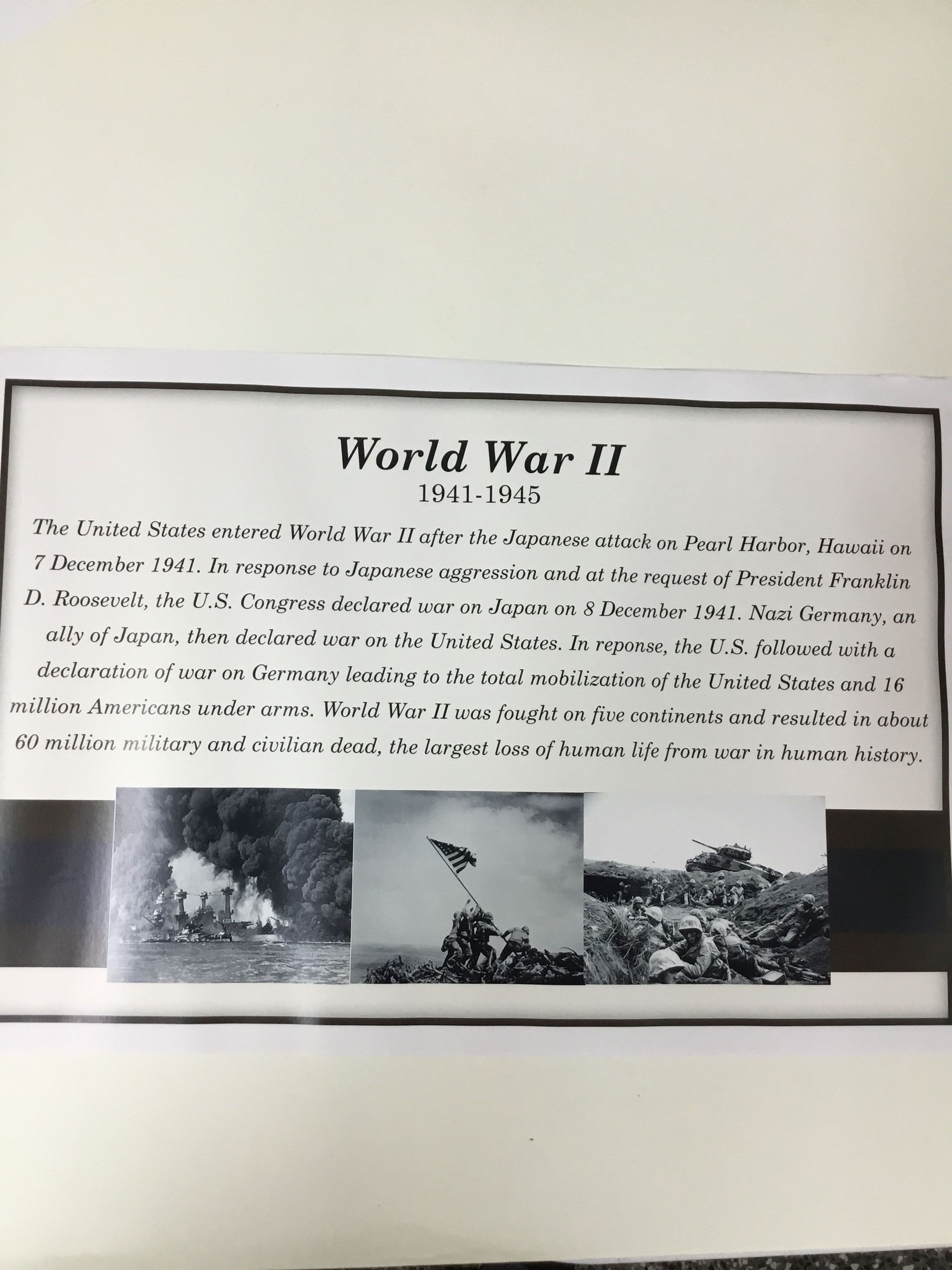A collection of 6 photos and descriptions about the WWI, WWII, Korean War, Vietnam War, War on Terror from 1917 to 2001.Collection