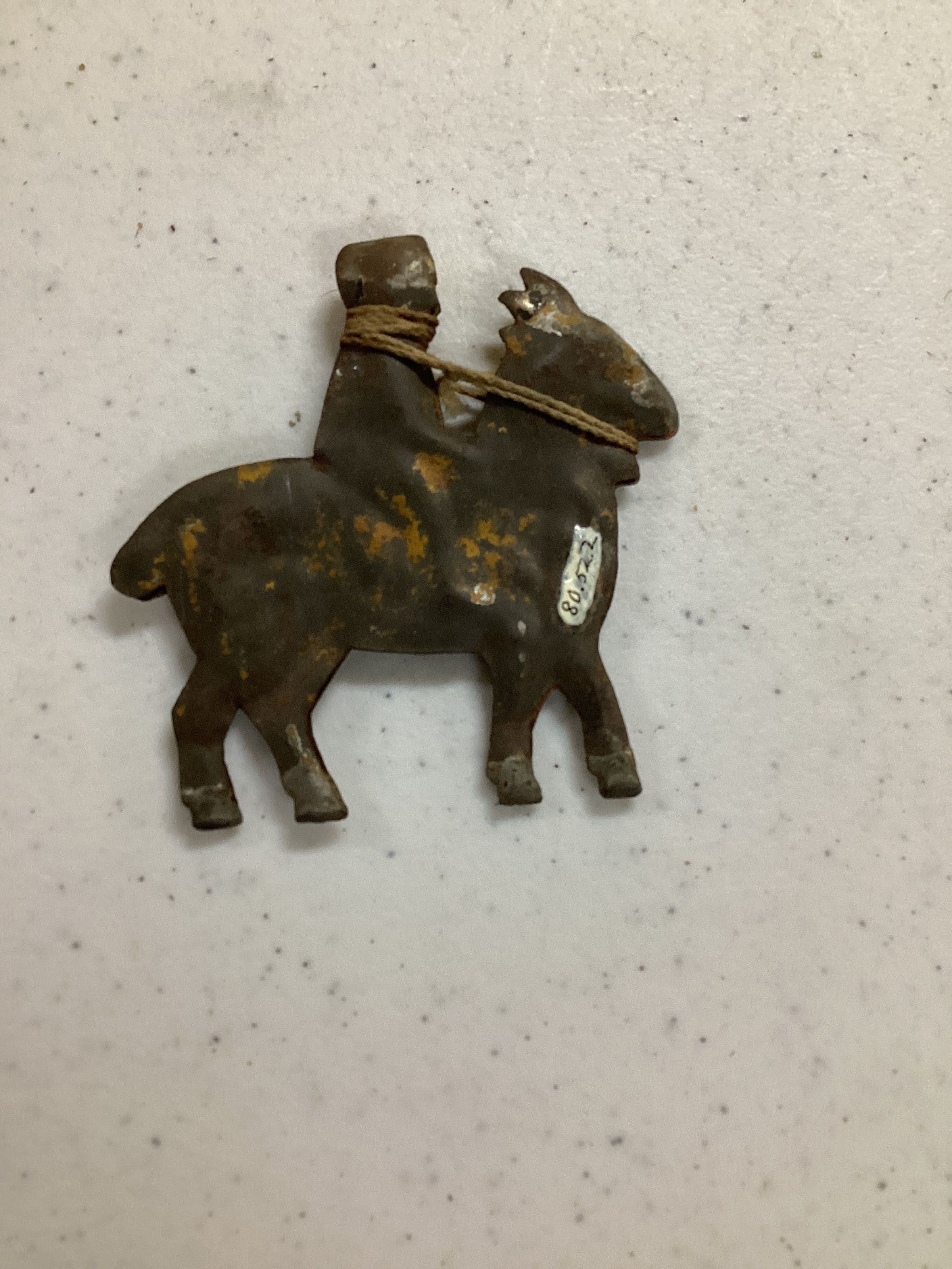 Small toy sized for a young child's hand. It is approximately 1/16" thick. Made of two pieces of stamped sheet iron fastened together. The sides do nt fit together properly. No effort at creating detail except for three points to represent horses ears and mane. Originally a yellow and silver color.Collection