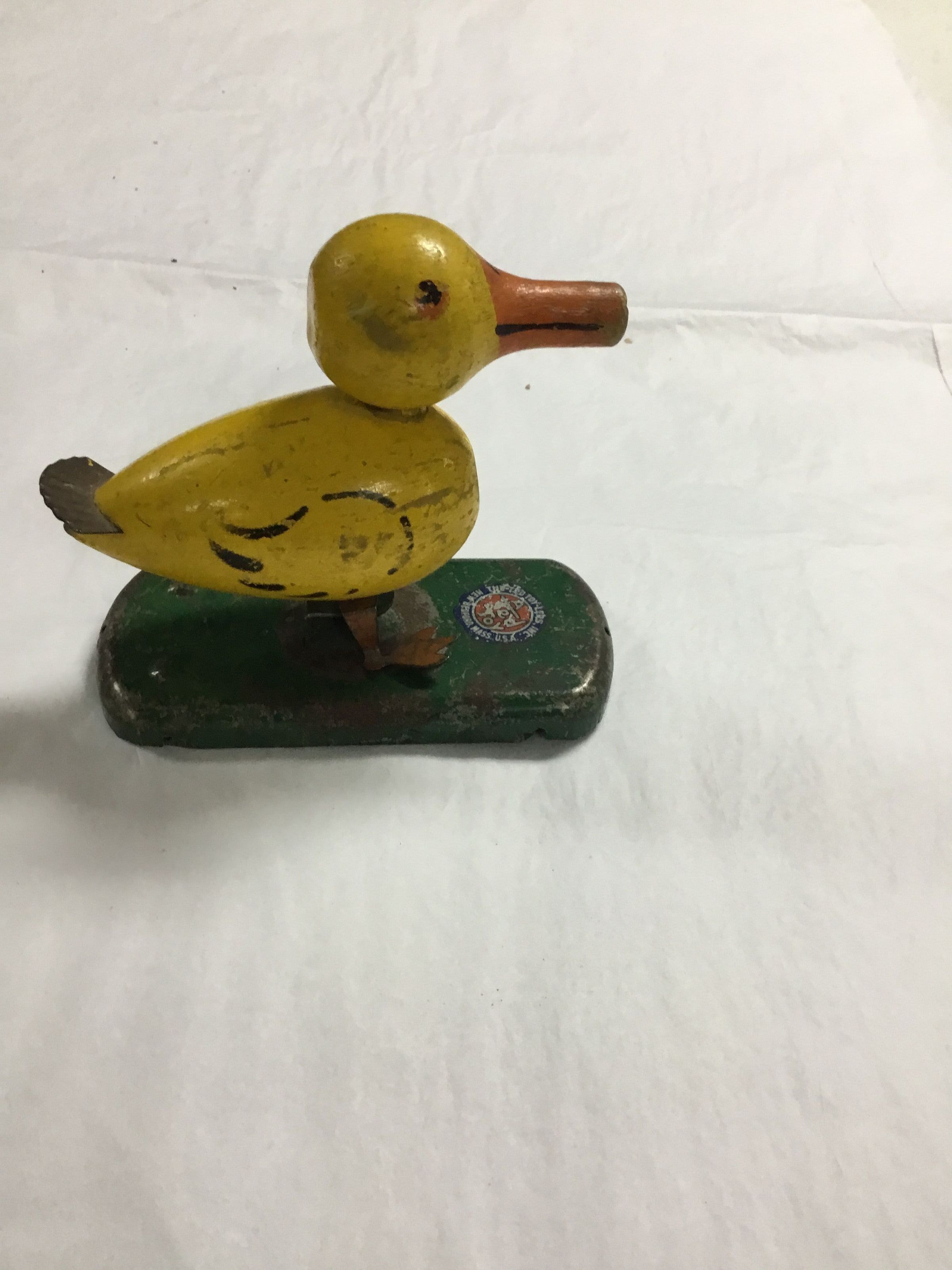 Do not believe all of the toy is here; base part has slots along bottom edge for tabs and these appear broken; may have been another part under this with either clock work or recreprical motor to make duck 'waddle'