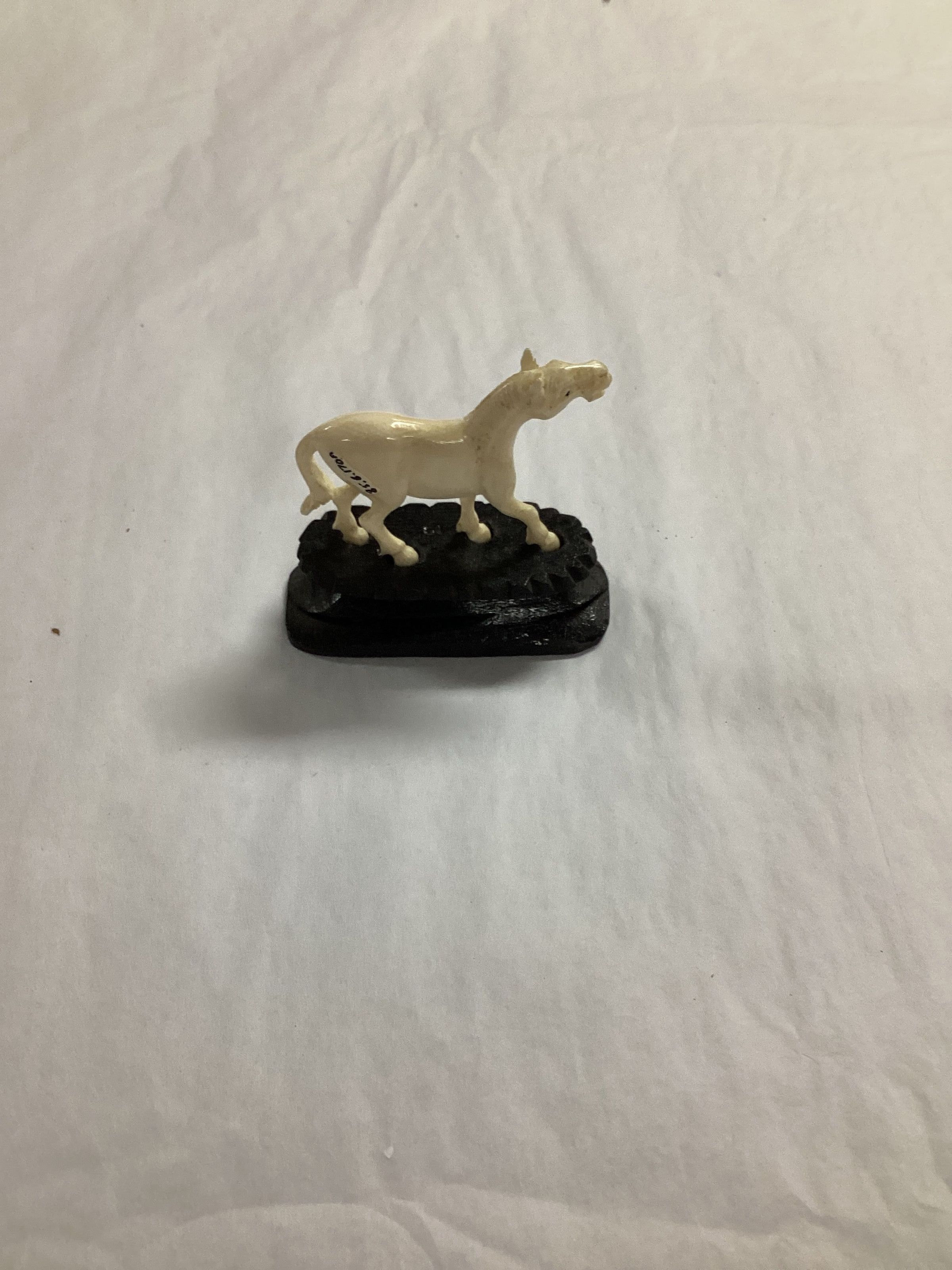 A: plastic white horse with black dots for eyes. B: a black wooden pedestal. Pedestal is 5/8" high and has a zig-zag edge around the top; there is a #3 stamped on top; four holes in top for the horses hooves. Horse is removable.Collection