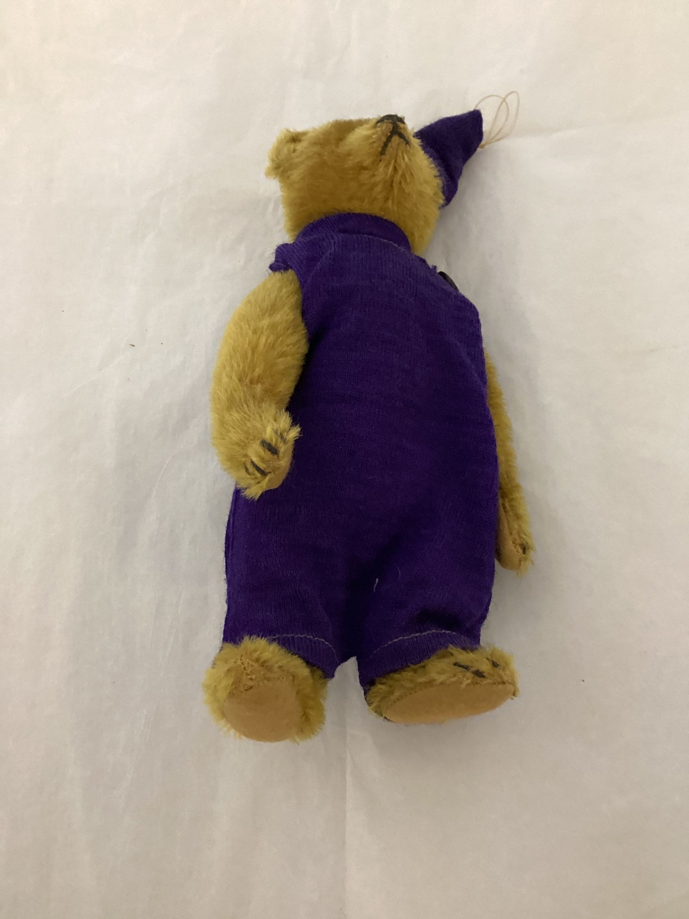 Golden brown, brown glass eyes, 1/4" diameter nose black, claws black, tan felt paws and pads. Dressed in knit, one-piece suit in two shades of purple Lighter shade of purple hat, pointed and placed over left ear. Collar light purple, suit darker shade.Collection