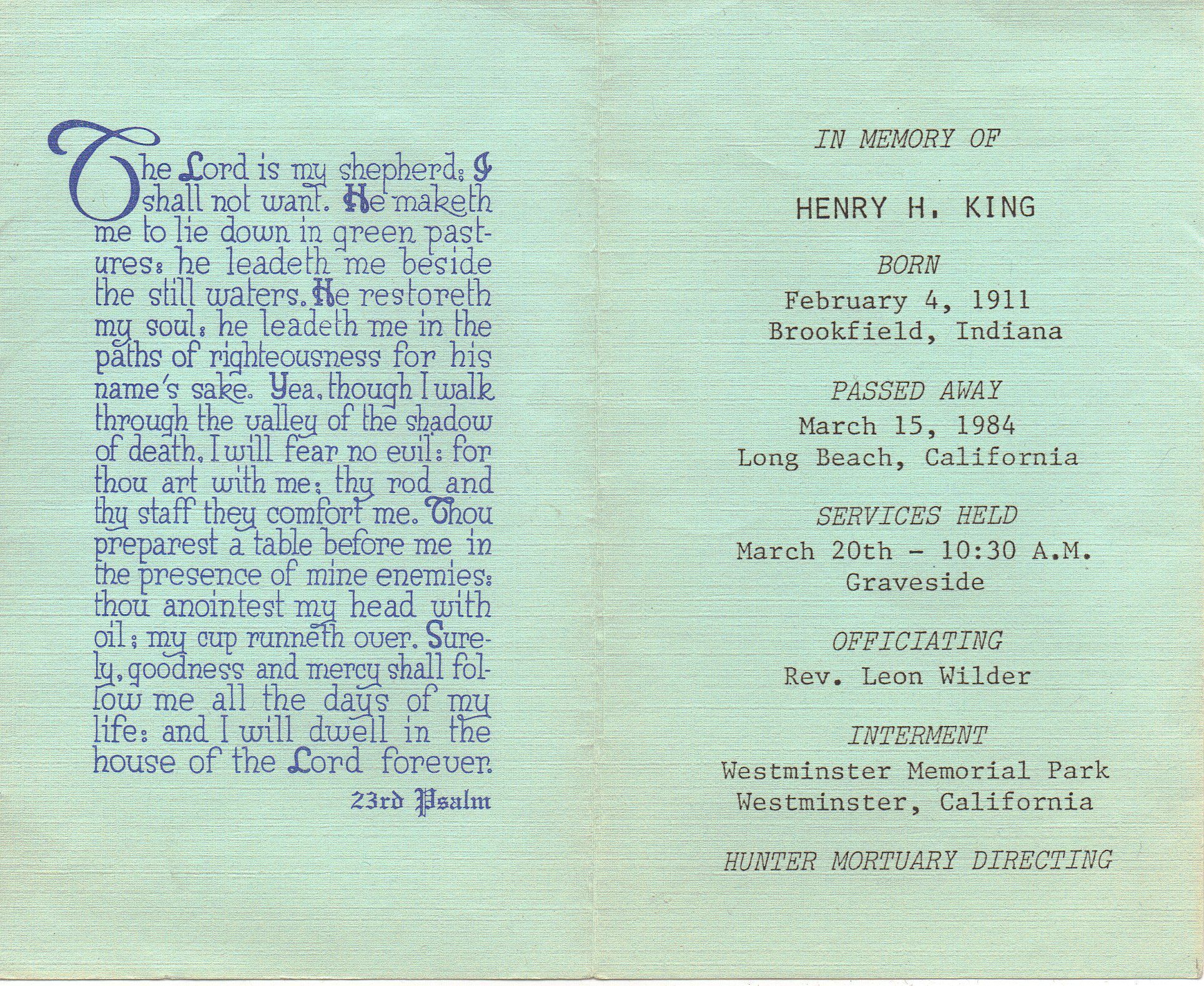 Blue paper funeral announcement of Henry Harrison King, Margaret's brother.