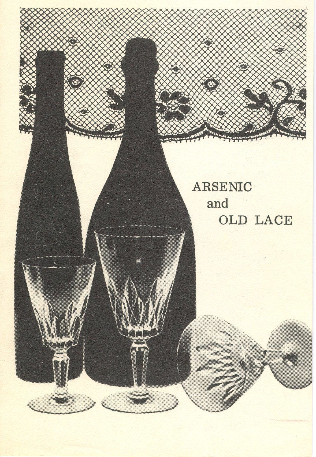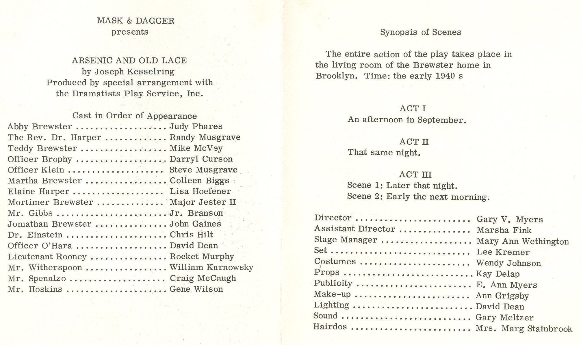 Program features the play "Arsenic and Old Lace," presented by drama club Mask & Dagger . Front cover shows graphics and title; back cover gives special thanks to various persons. Inside the program there is a list of characters in order of appearance, and a synopsis of scenes.