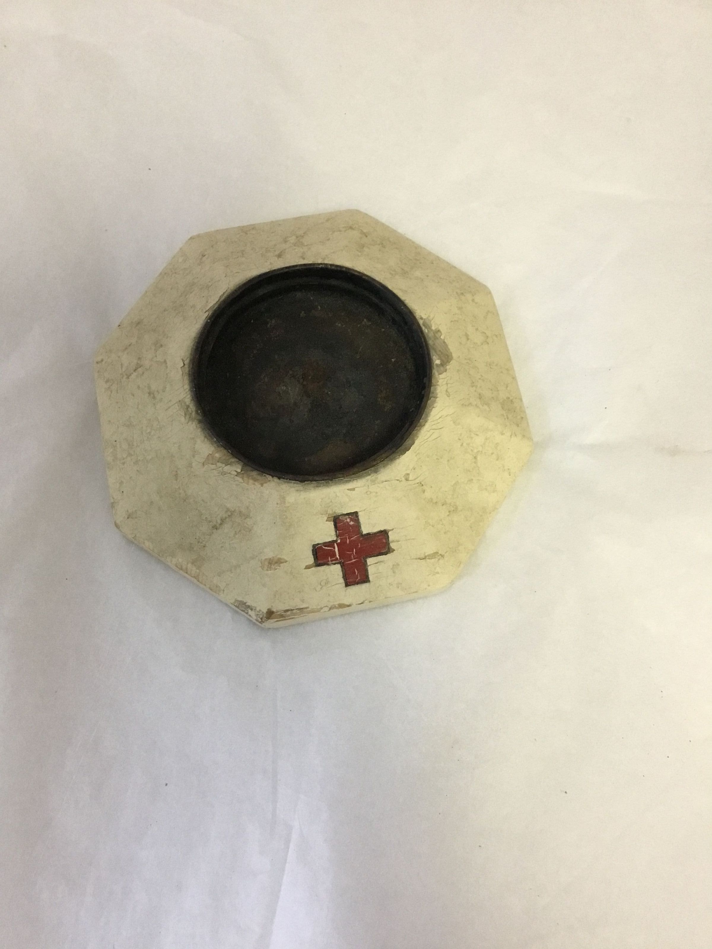 Wood, hexagonal-shaped, painted white w/ red cross.Use