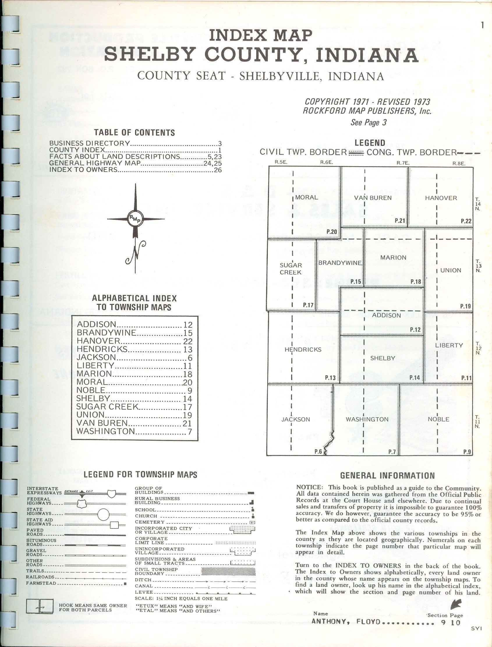 Page 1 title: Index Map/Shelby County, Indiana/County Seat - Shelbyville, Indiana. Book contains information about Shelby County and it's fourteen townships.