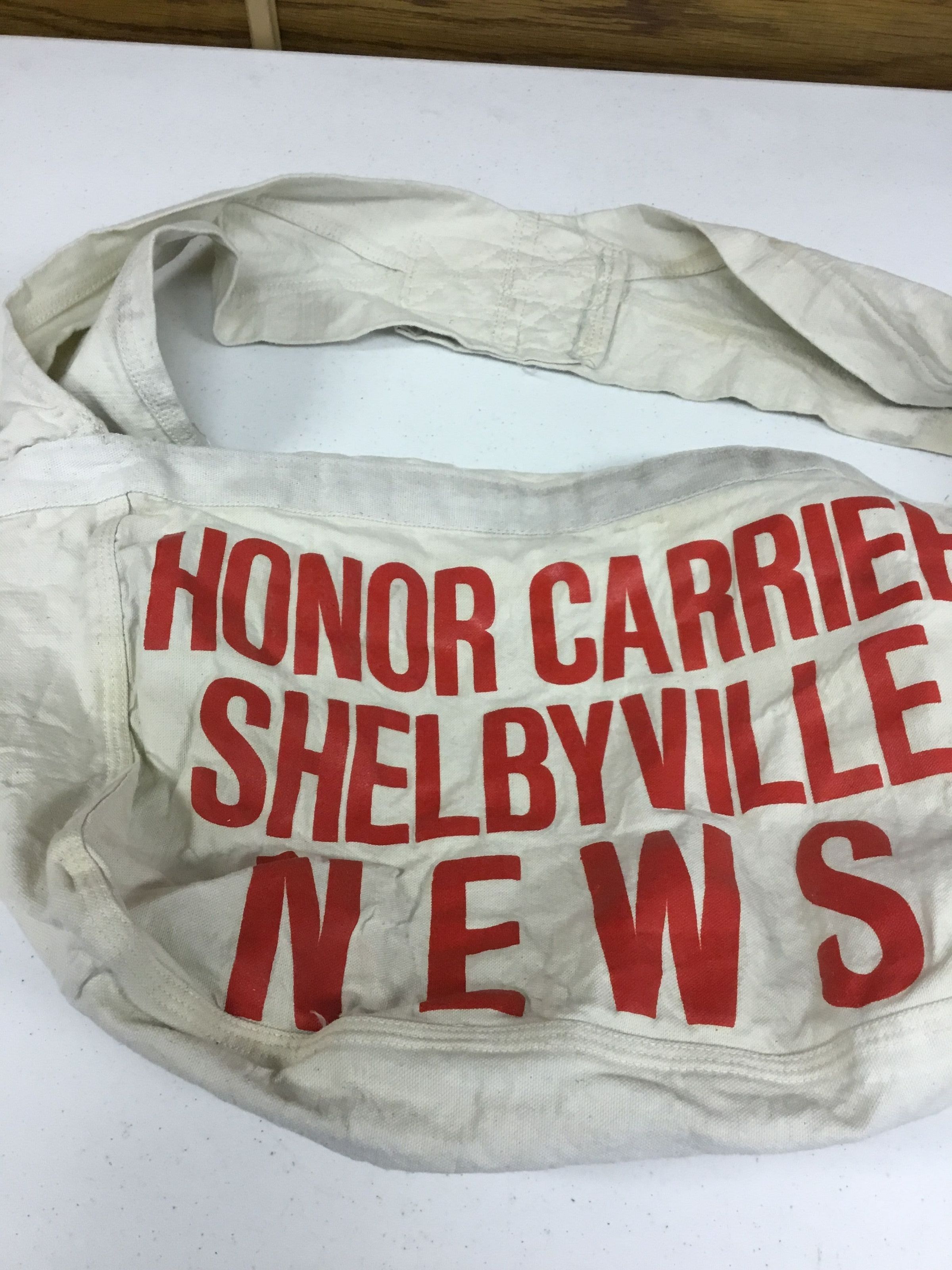 Newspaper carrier bag, "HONOR CARRIER-SHELBYVILLE NEWS" on it. Has a strap for carrying on the shoulder and a flap to cover top opening. Off-white cotton.Collection