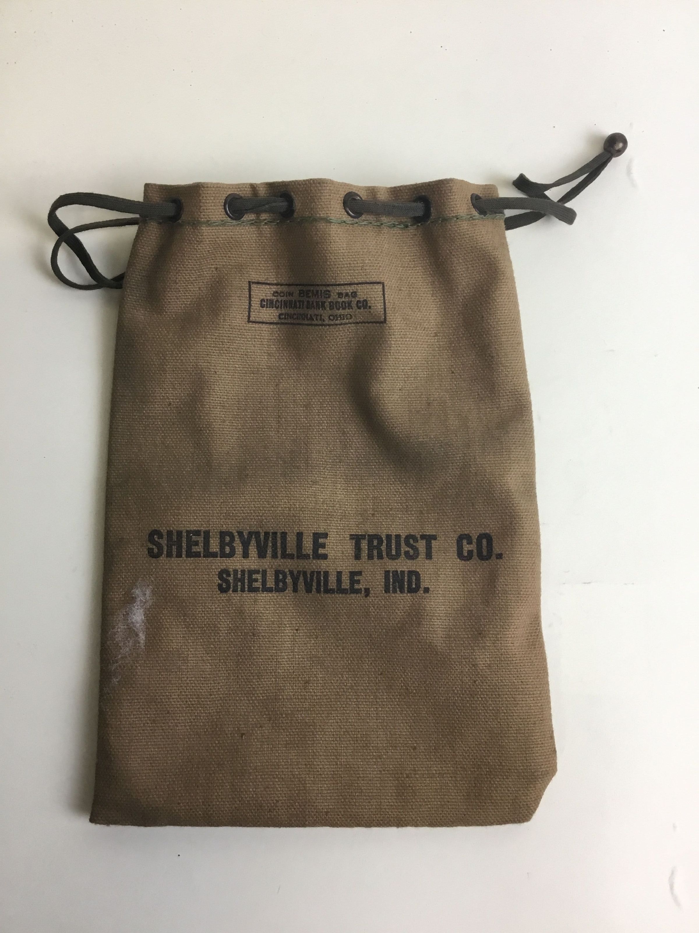A tan-colored bag with black printing on it, a shoestring drawstring with small ball tags. 1/2" hem at top. Used for collecting money.Use