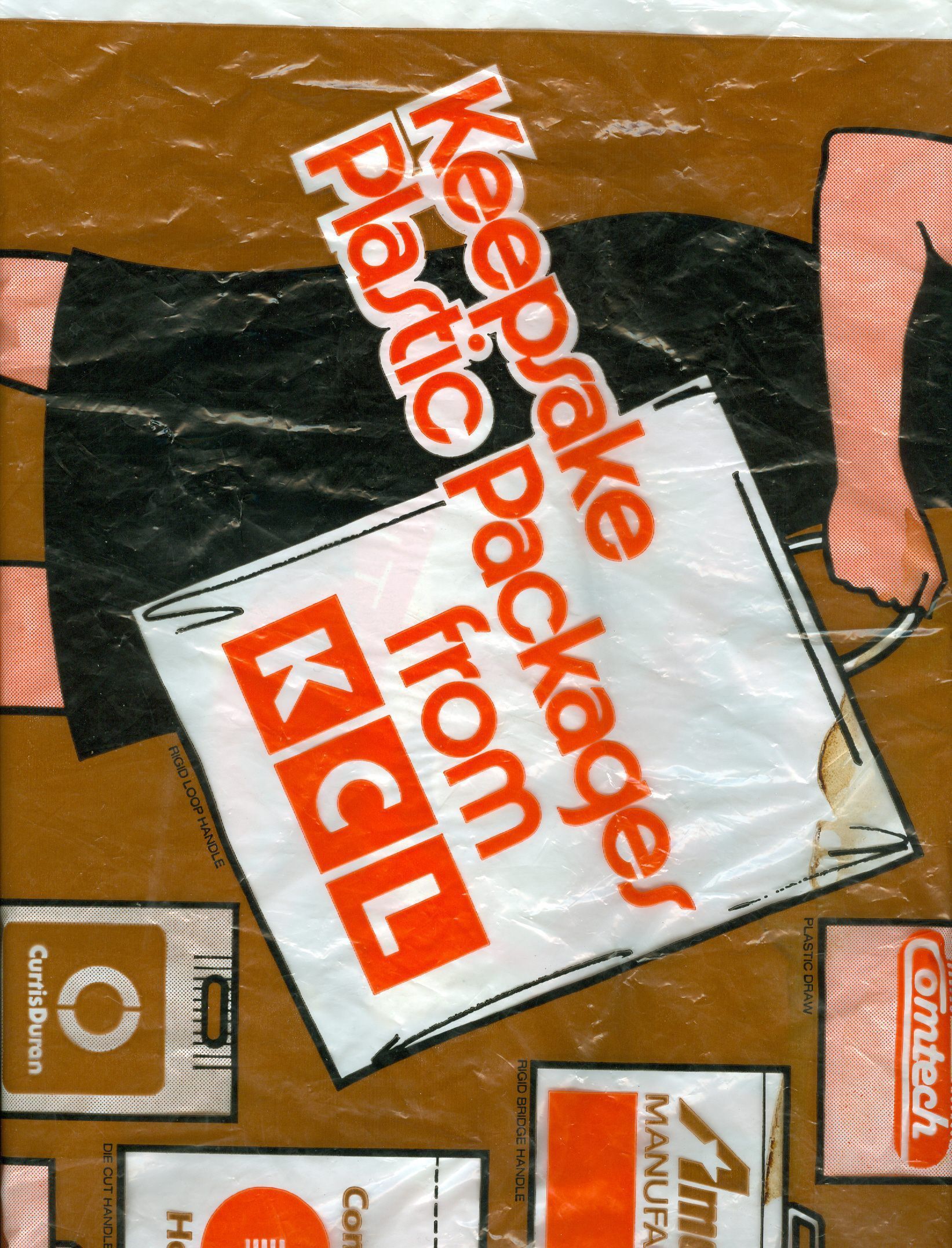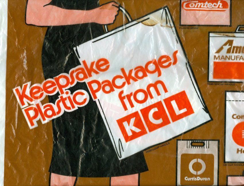 Side two reads: Keepsake plastic Packages from KCL. Shows a partial female figure hold a bag with handles-under it, type of handle reads: rigid loop handle; right side of bag shows 6 different types of plastic packages, each one having a label under the image, specifying type: plastic draw; rigid bridge handle; die cut handle hole; patch handle;soft loop handle; draw string.Collection