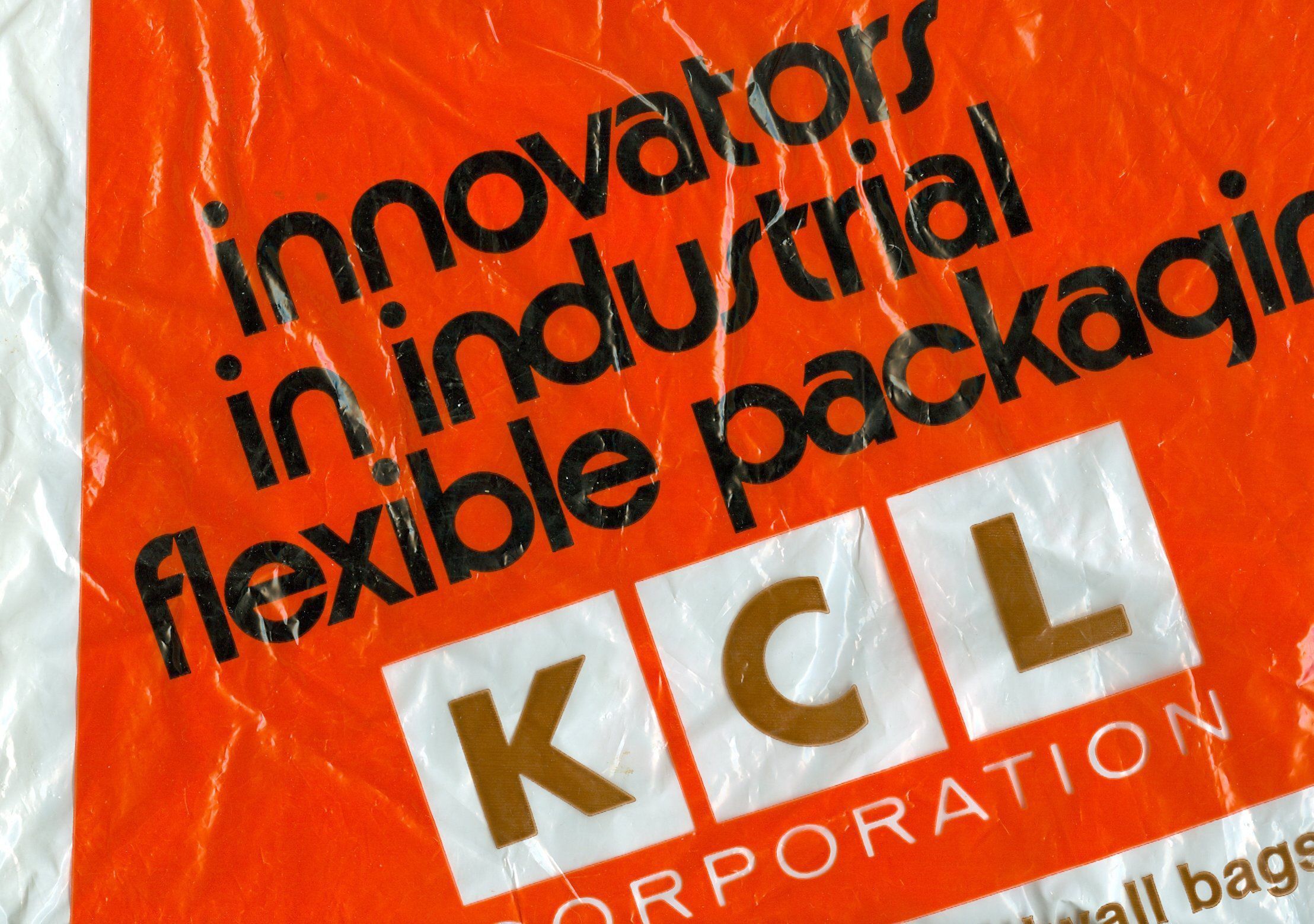 White plastic tote bag; yellow plastic handles, molded flutes for easy grip. Orange, brown, and black type and graphics on both sides. Side one reads: innovators/in industrial/flexible packaging/KCL CORPORATION; bulleted sub type under company name.