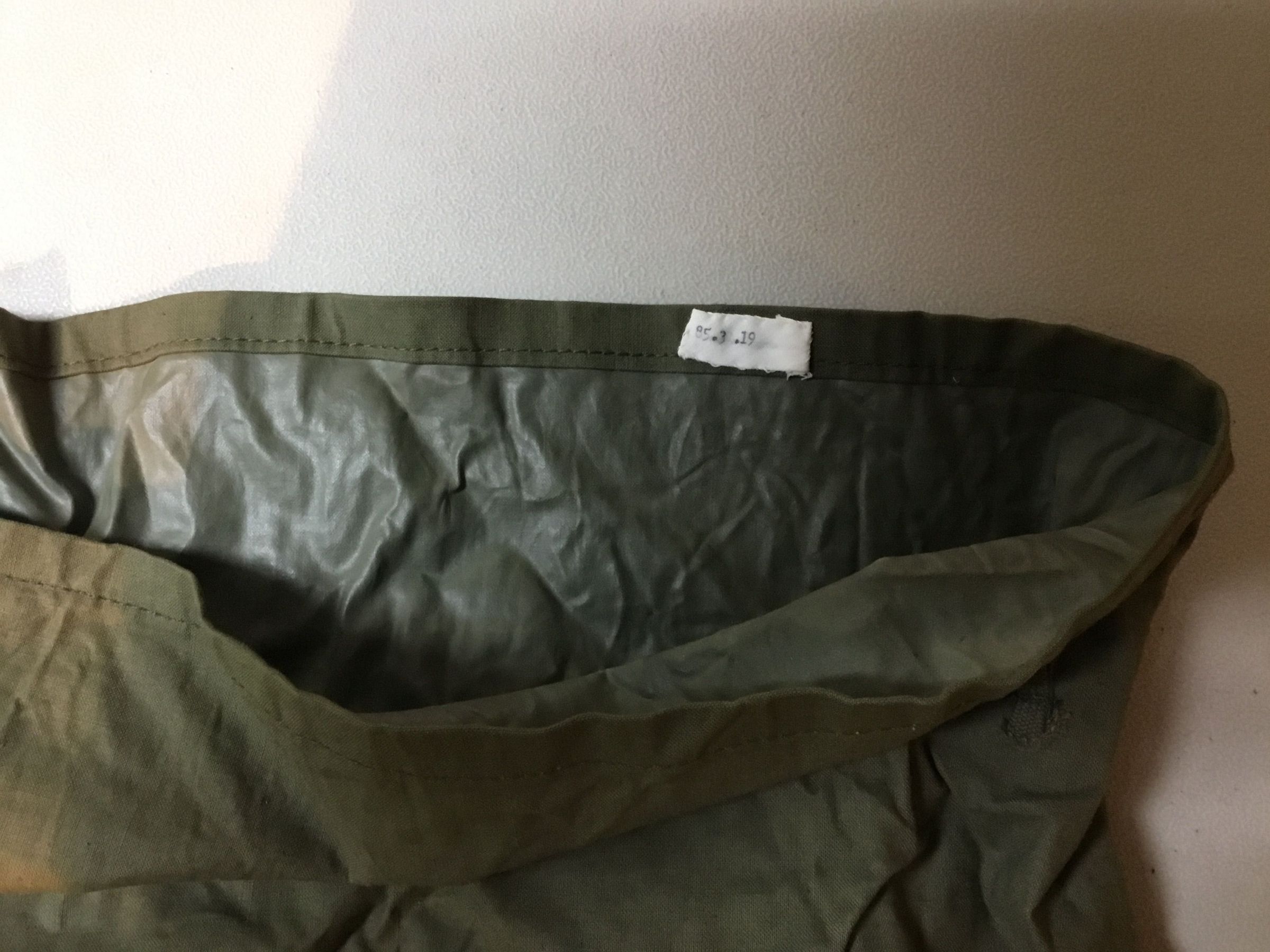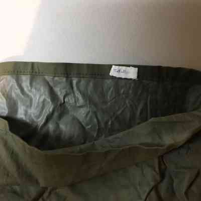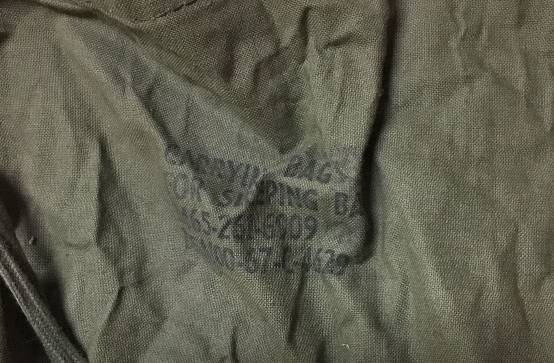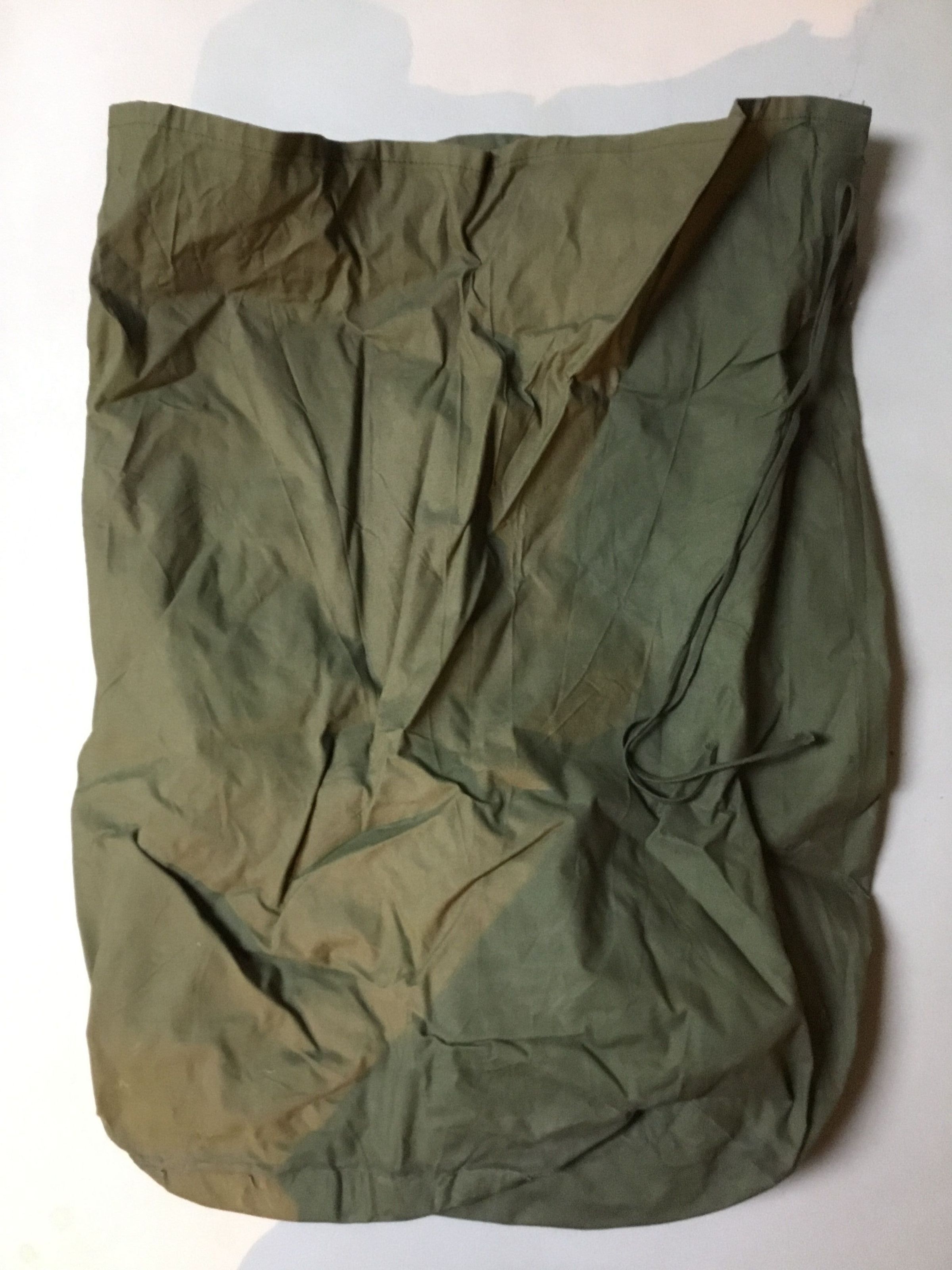 Army green carrying bag for sleeping bag; tubular in shape with rounded bottom, 1/2" hem at top, 24" twill shoestring ties on each side of top.