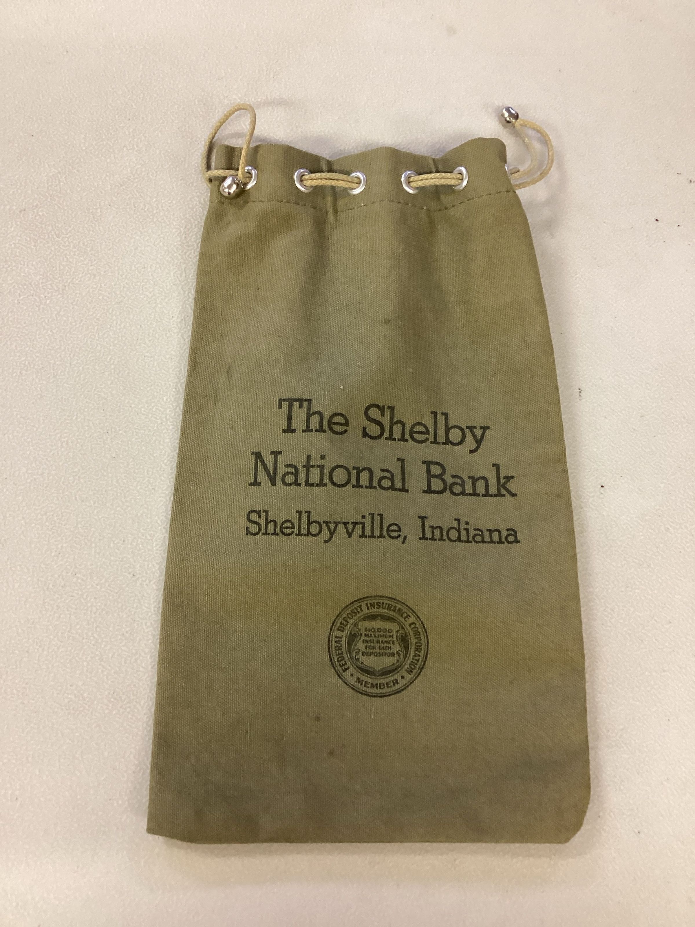 Olive heavy muslin money bag from Shelby National Bank. Back side has written CONNOR.