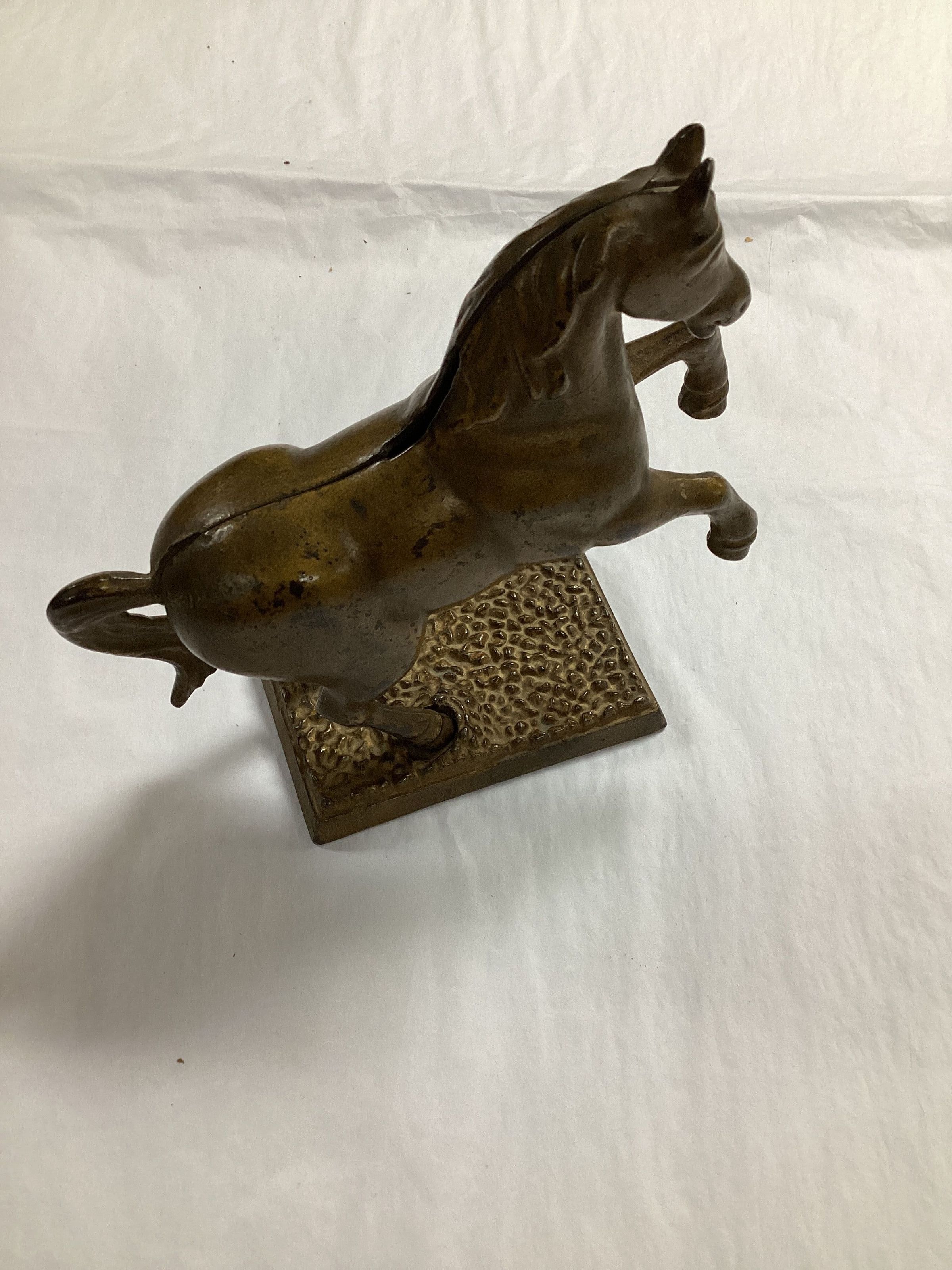 Cast iron bank in the shape of a horse rearing on its back legs; painted sort of bronze color; tail is part of left side and attached to rear left leg; there is a screw on left side holding halves together; slot for coins is at base of neck; horse removes from base by turning upside down and removing screw in right rear hoof; left rear hoof terminates in a hook that secures into base; both the screw and the hook are hidden from view when bank in correct position. Donated in memory of Wilbur M. Good ( 02/06/1892 to 01/29/1979) and Myron W. Good (09/18/1922 to (06/13/1985)Collection