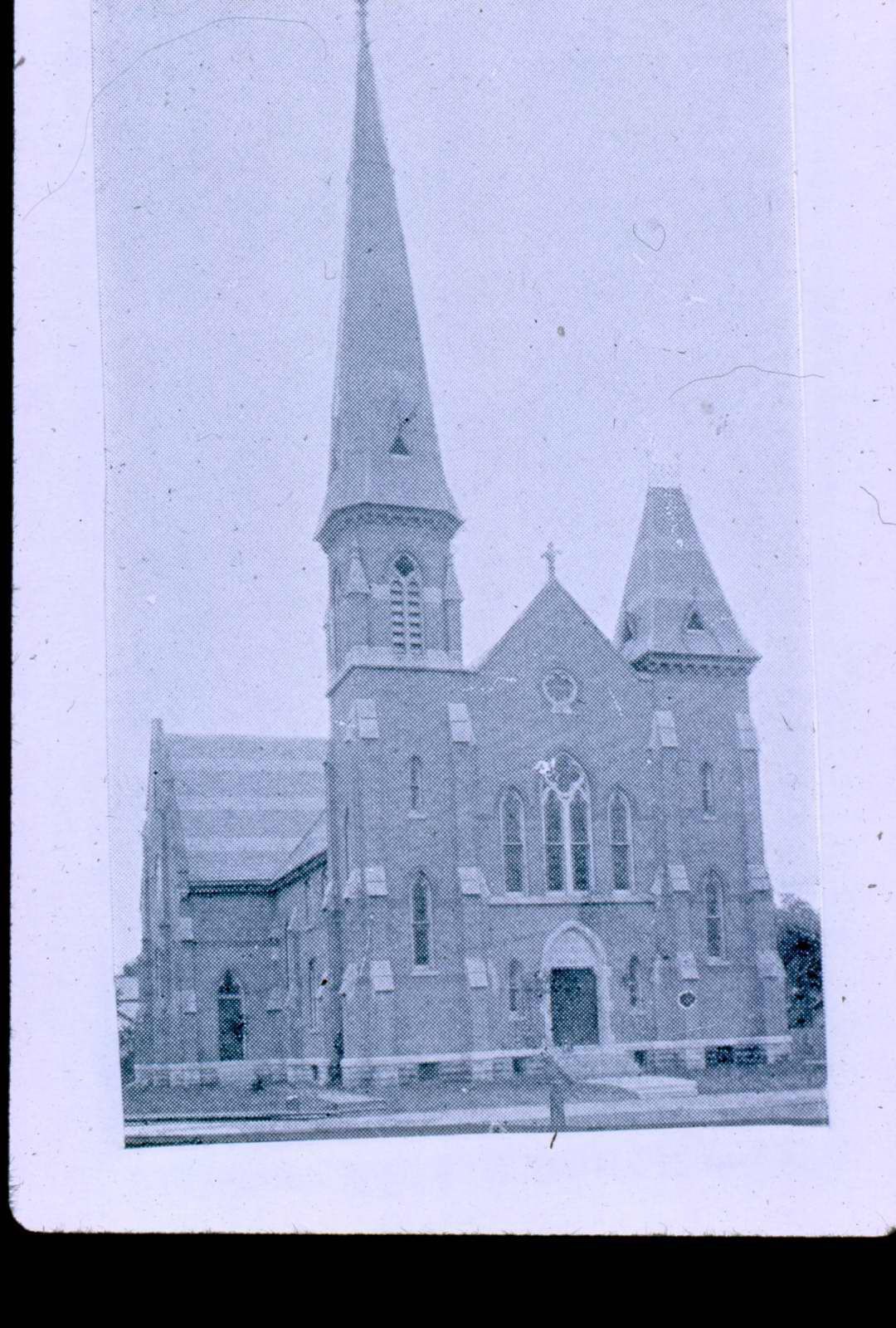 Black and white photographic slide in portrati format. Slide frame is marked: "Original Baptist Church/1902"Collection