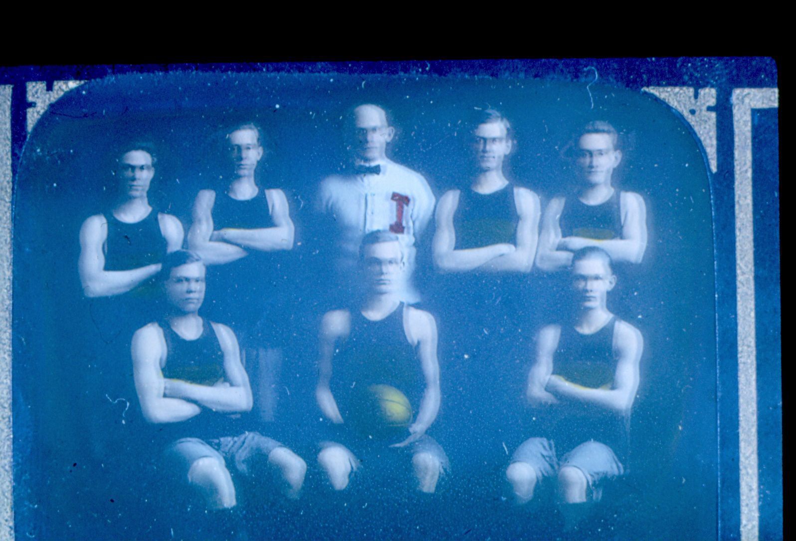 Donation, 07/26/2005. Black and white photographic lantern slide in landscape format. Slide frame is marked: "SHS Basket Ball Team/Dorsey Jones Coach." At bottom of slide frame: "Lantern Slide"Collection