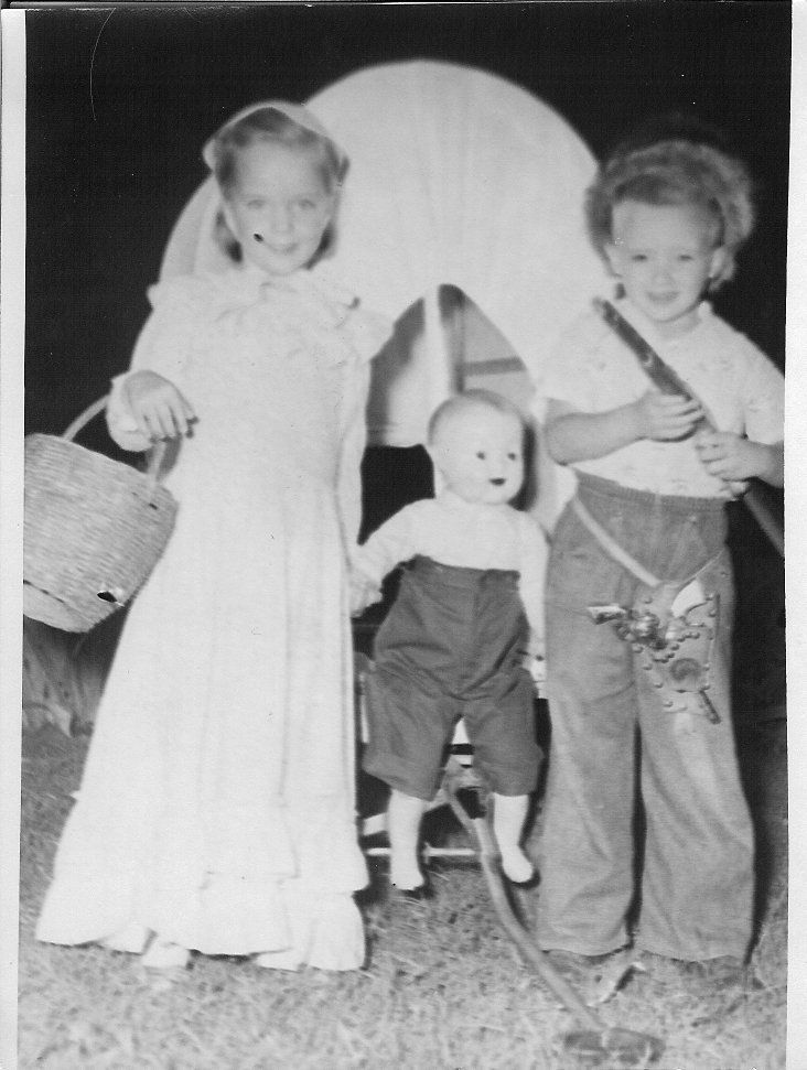 Black and white photograpic snapshot of little girl with long dress and bonnet; she is carring a basket; little boy has koon skin hat, toy gun and toy halster gun; small wagon with covered top; soll setting in front of wagon 1983.053.058 is attached same picture but it is in better shape.Collection