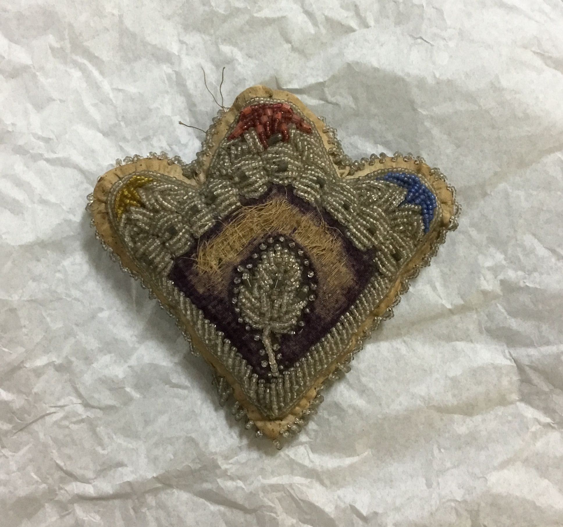 Beaded pin cushion, some beads missing at very tip. Three humps at top.Collection